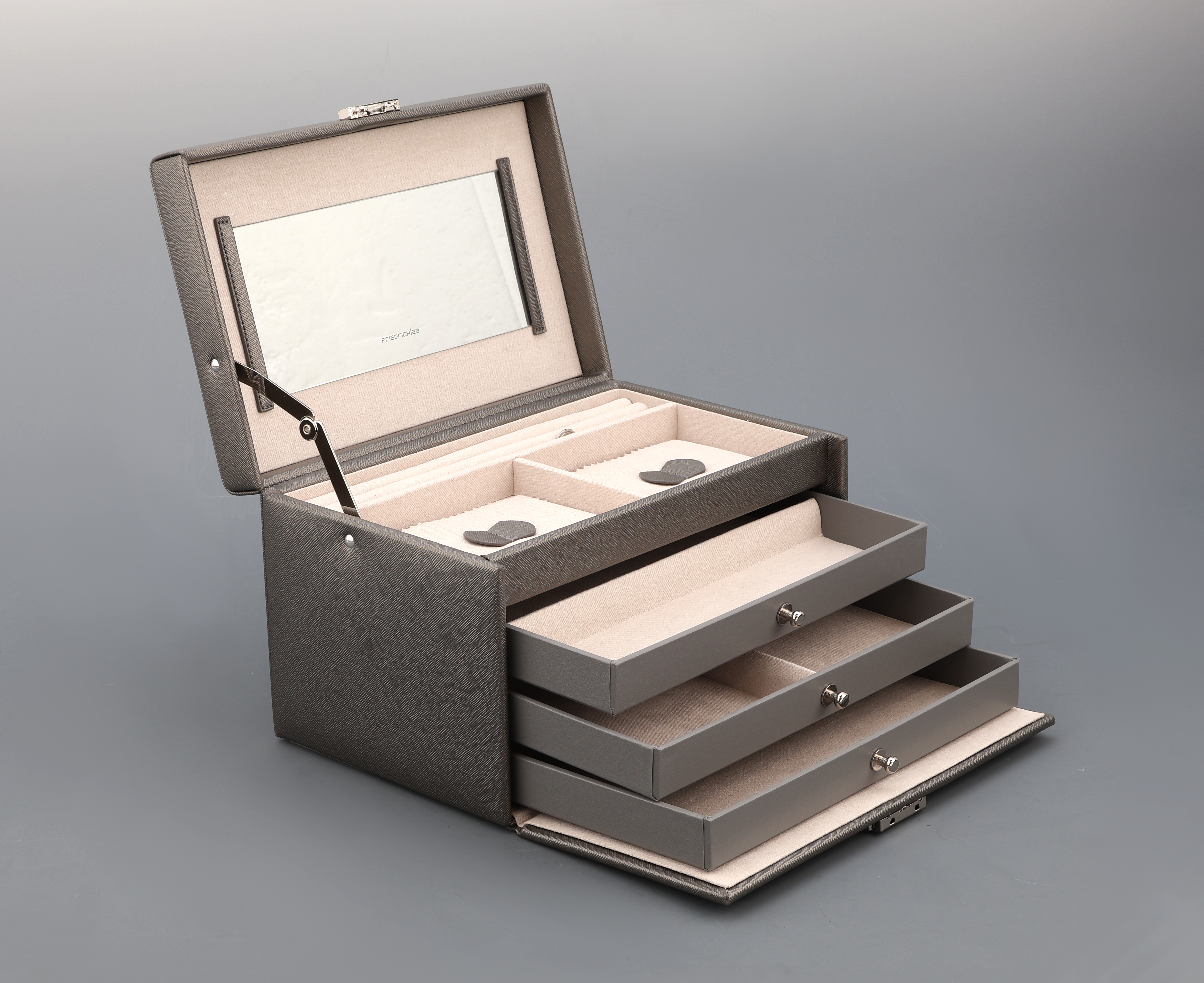 Innenspiegel, 2 Fächer mit Abdeckkissen, Ringleisten, 3 Schubladen mit Unterteilungen,
