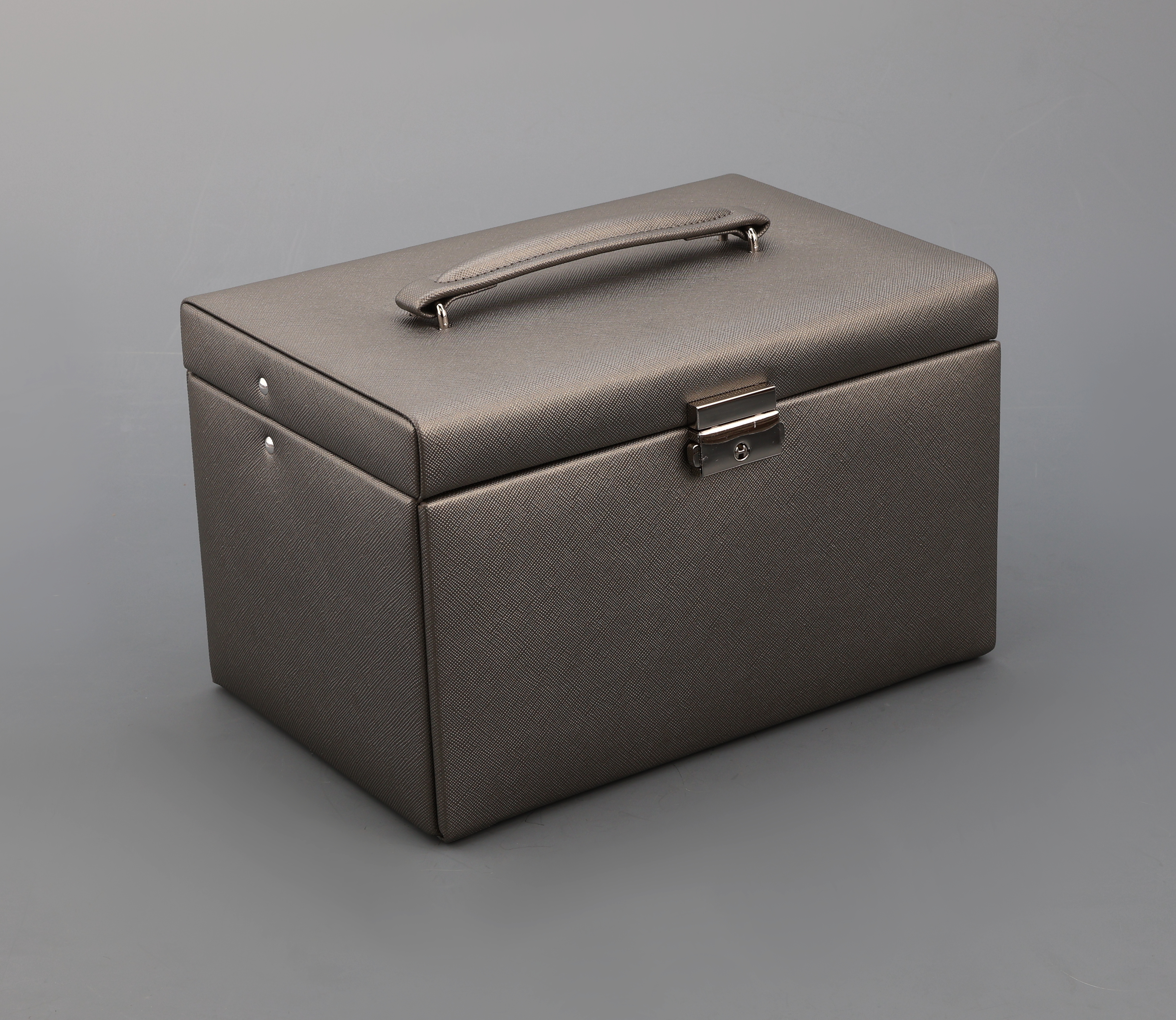 Schmuckkoffer aus zinnfarb. Feinsynthetik, Kreuznarbendekor, beiges Innenfutter,