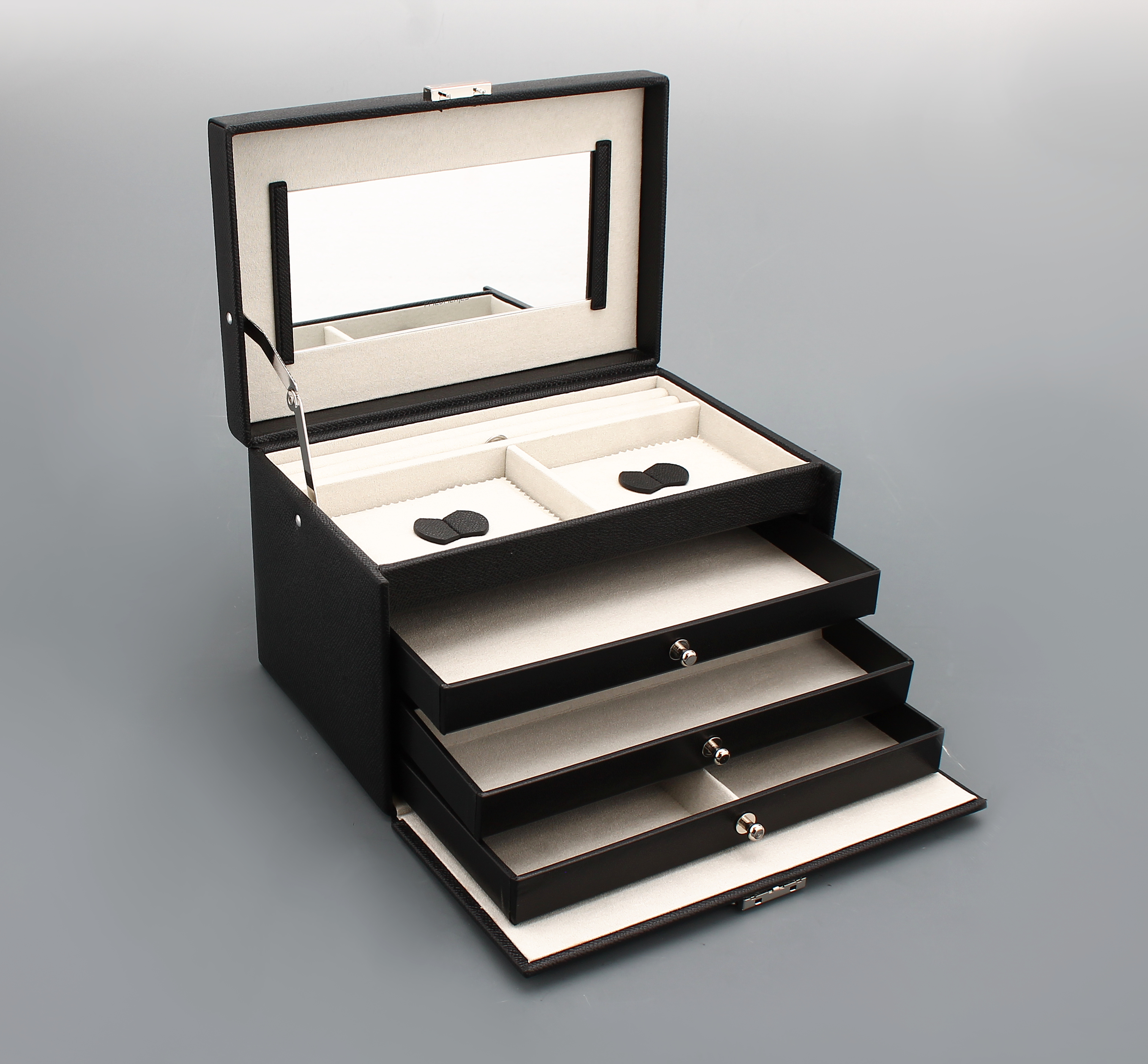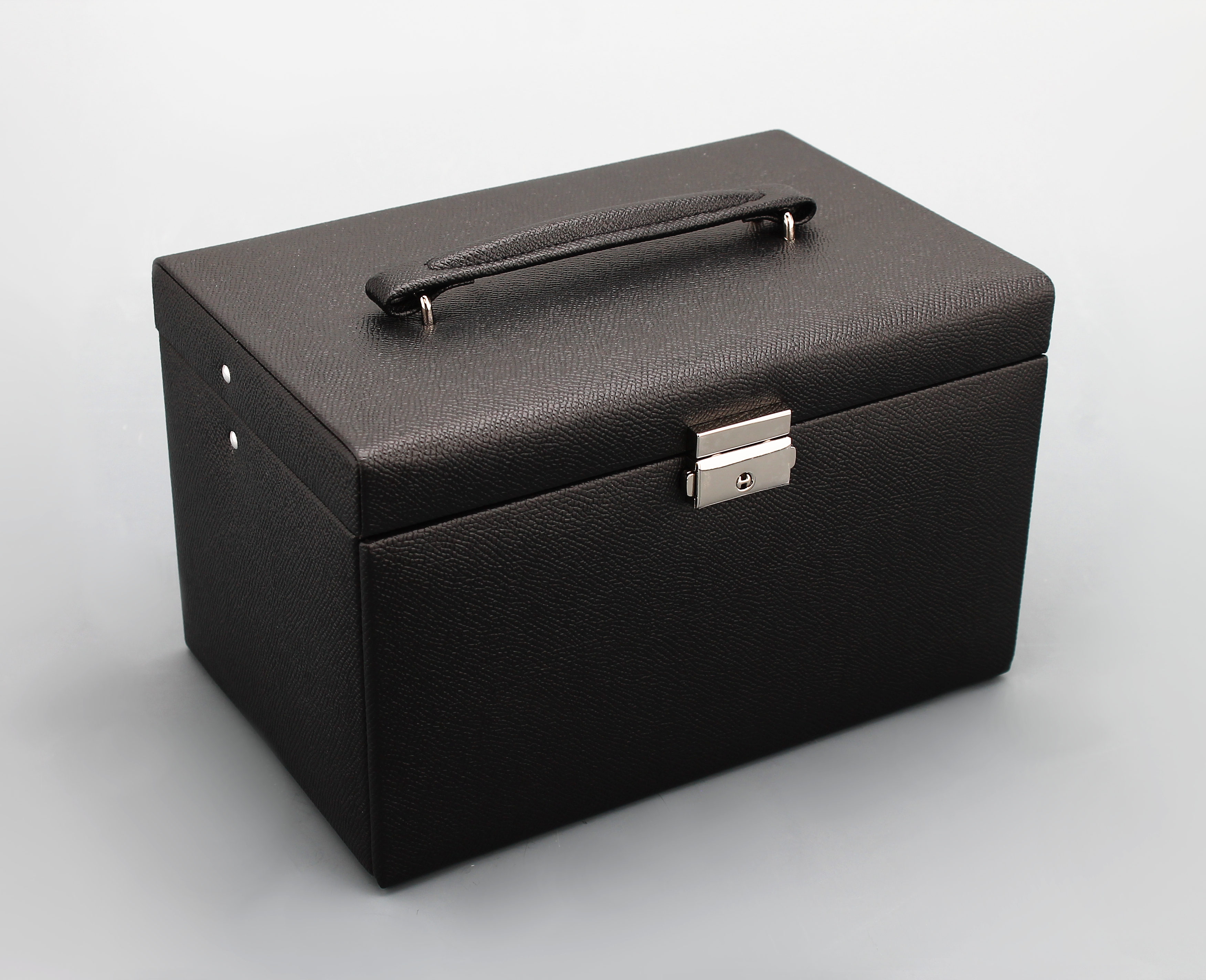 Schmuckkoffer aus schwarzem Feinsynthetik, Kreuznarbendekor, beiges Innenfutter,
