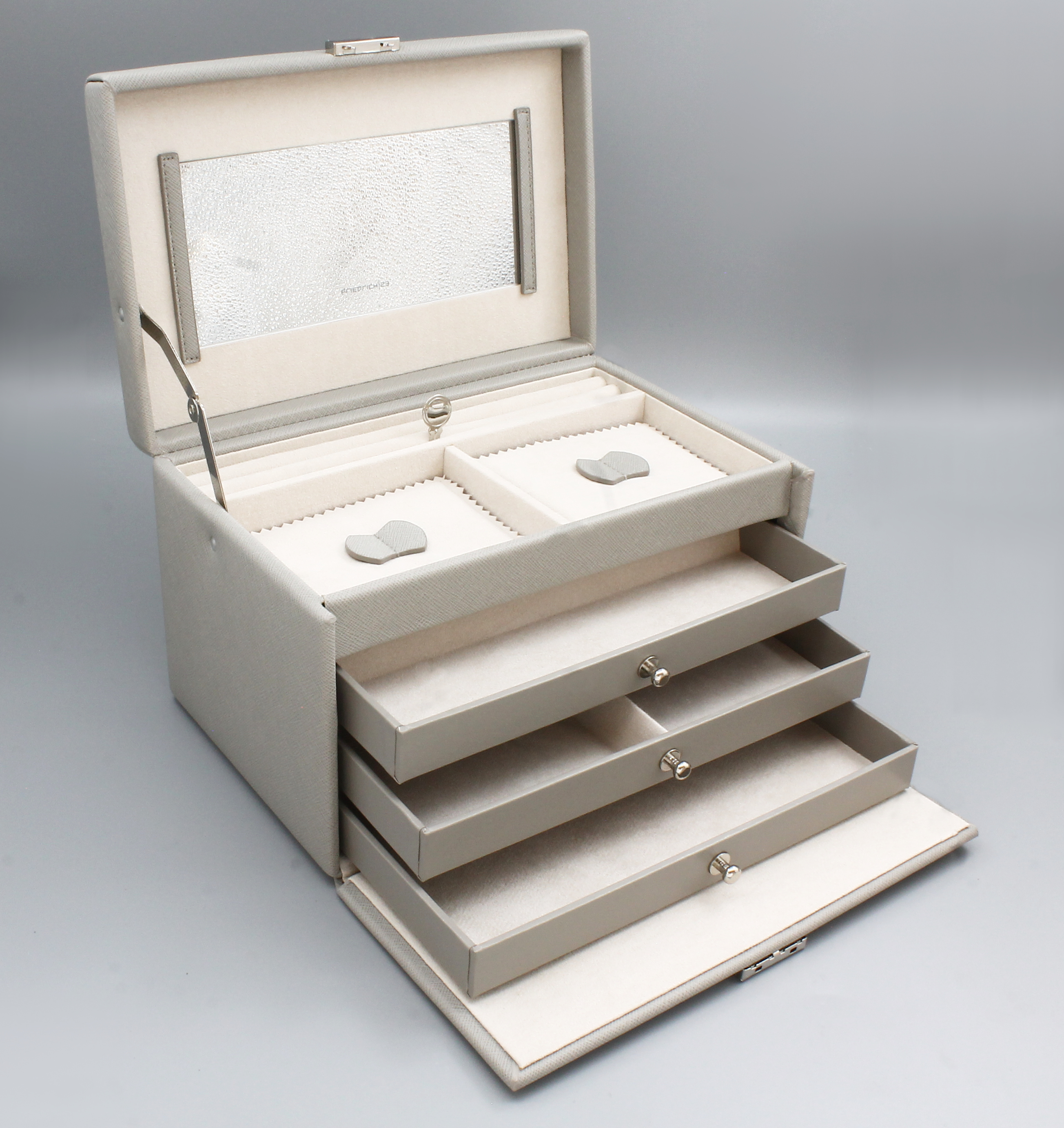 Schmuckkoffer aus grauem Feinsynthetik, Kreuznarbendekor, beiges Innenfutter, Innenspiegel,