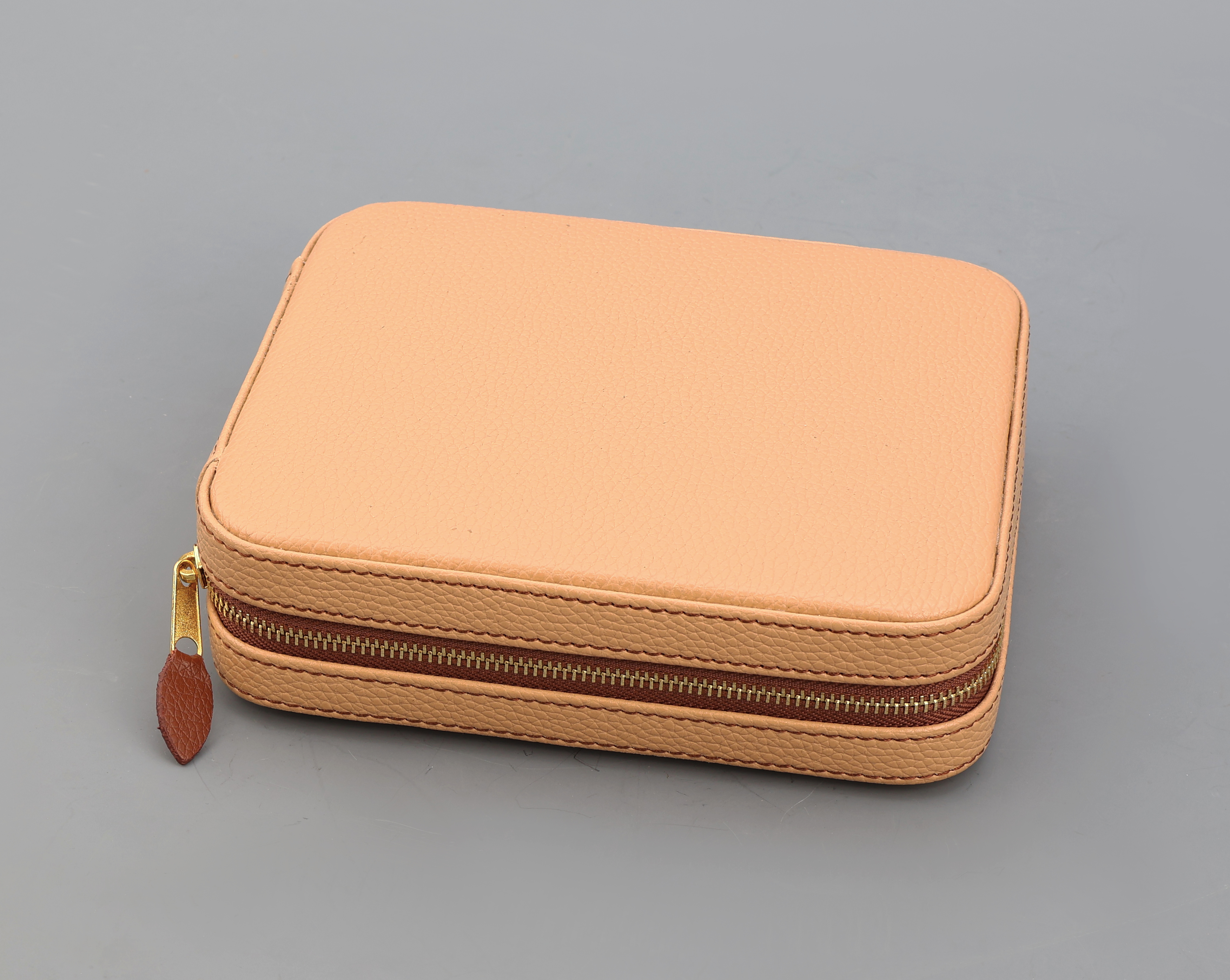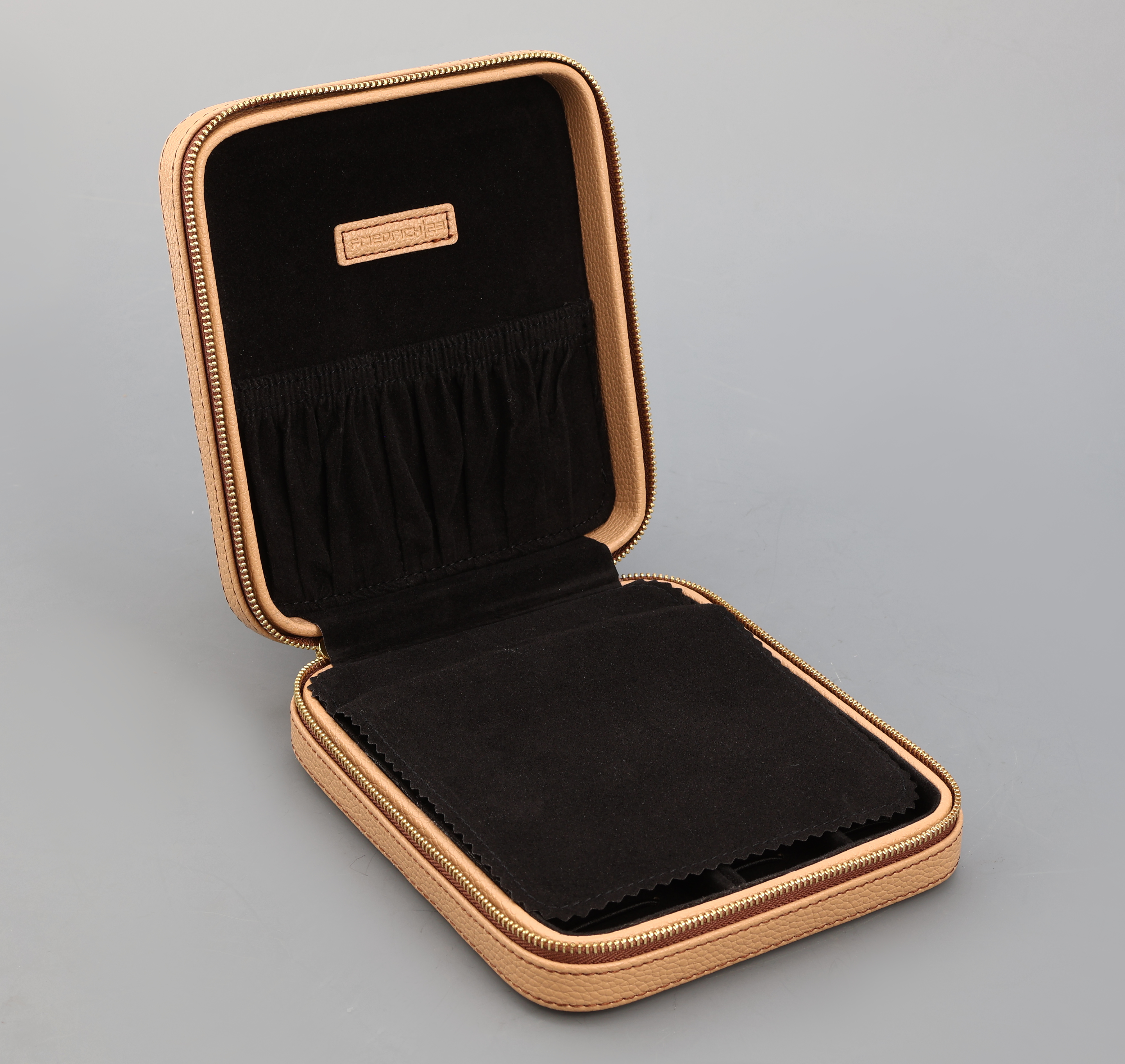 Reiseetui für Schmuck und Uhren, dunkelbeiges Kunstleder, schwarze Inneneinrichtung,