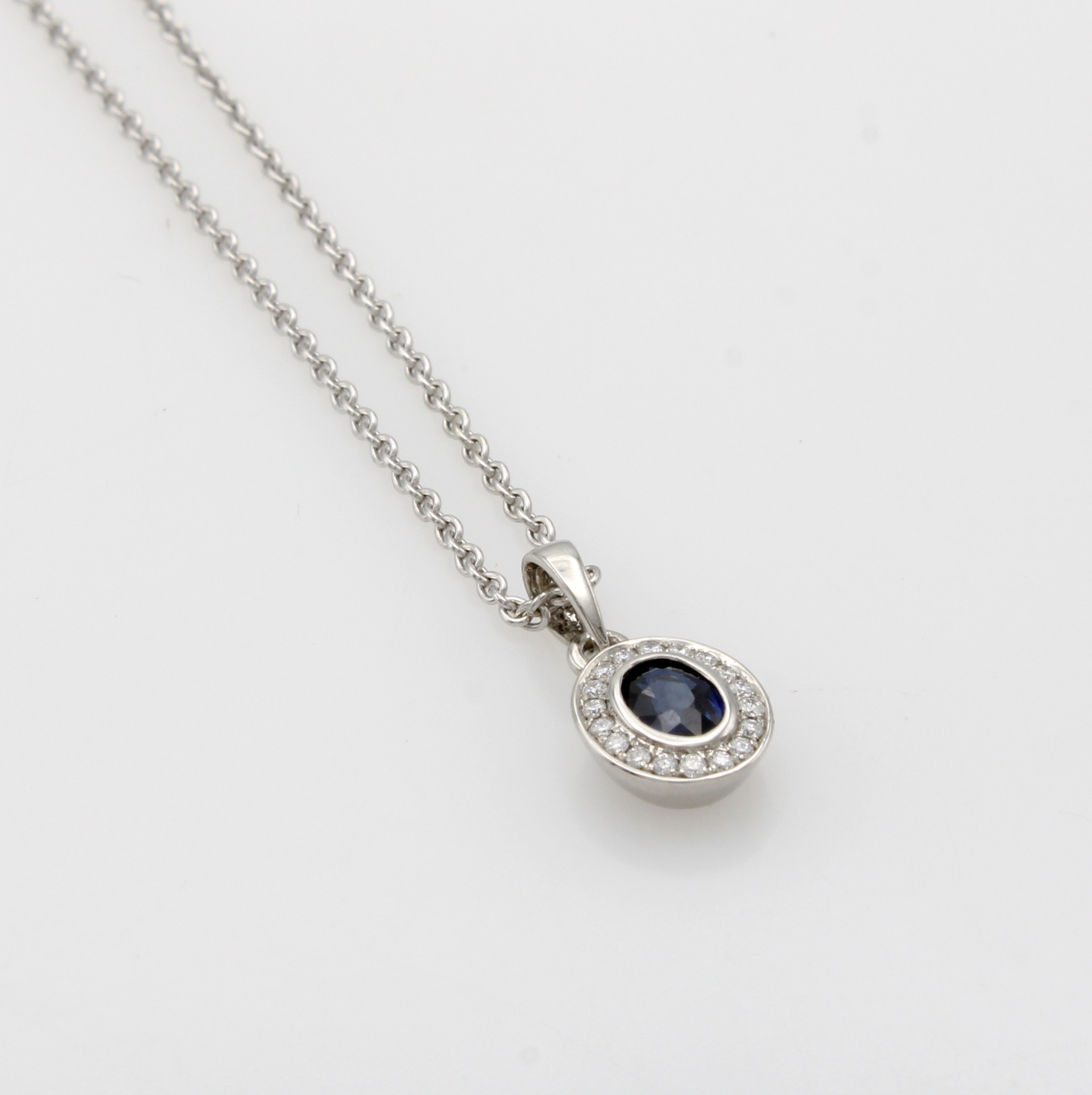 Anhänger mit Saphir und Brillanten an Kette, WG 590/000, ovaler Saphir umgeben v. Brill.zus. ca. 0.04 ct Weiß/si, L. ca. 42 cm Schätzpreis: 1320, - EUR