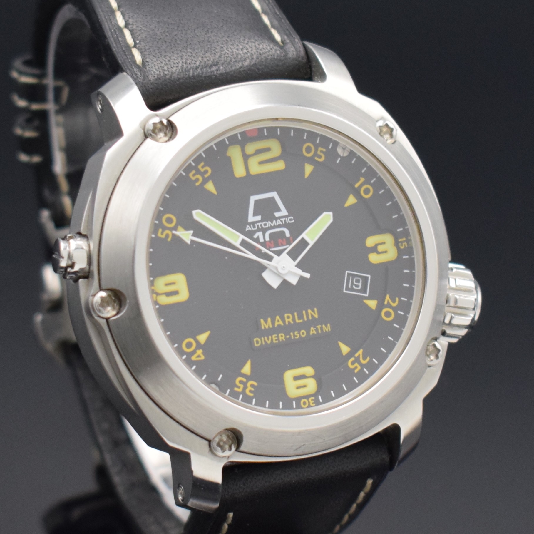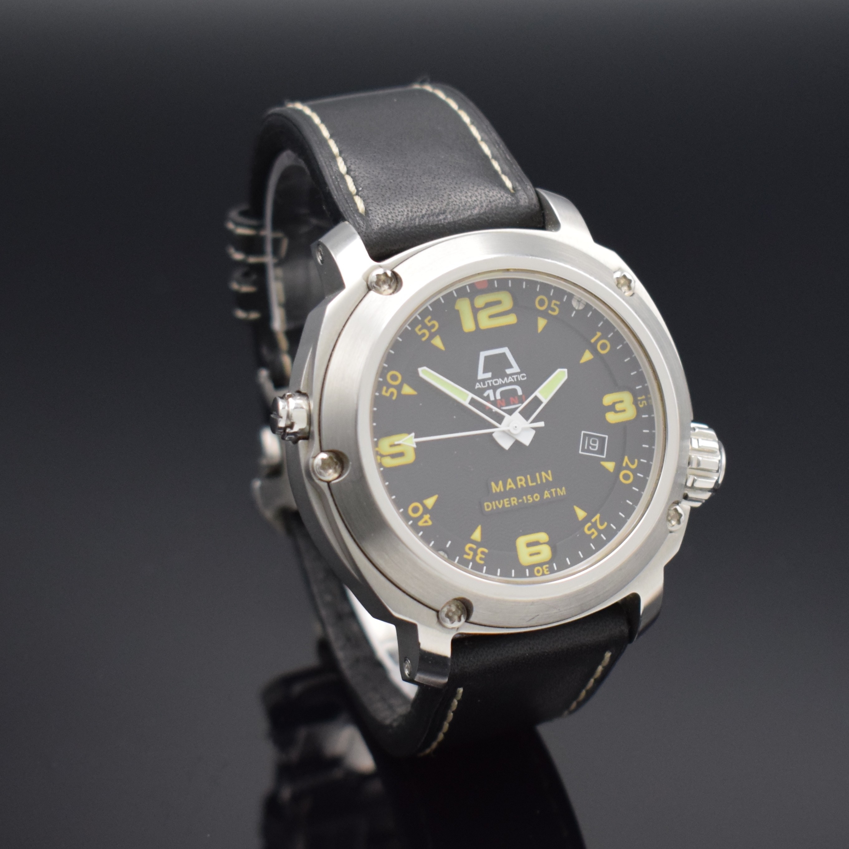 ANONIMO Marlin Diver-150 ATM Opera Mecana 7001 limitierte Herrenarmbanduhr, Automatik, massives verschr. Edelstahlgeh., Kontrastzifferbl. m. arab. Zahlen, Leuchtzeiger, Datum, Lederband m. orig. Faltschl., D. ca. 46 mm, EZ 2