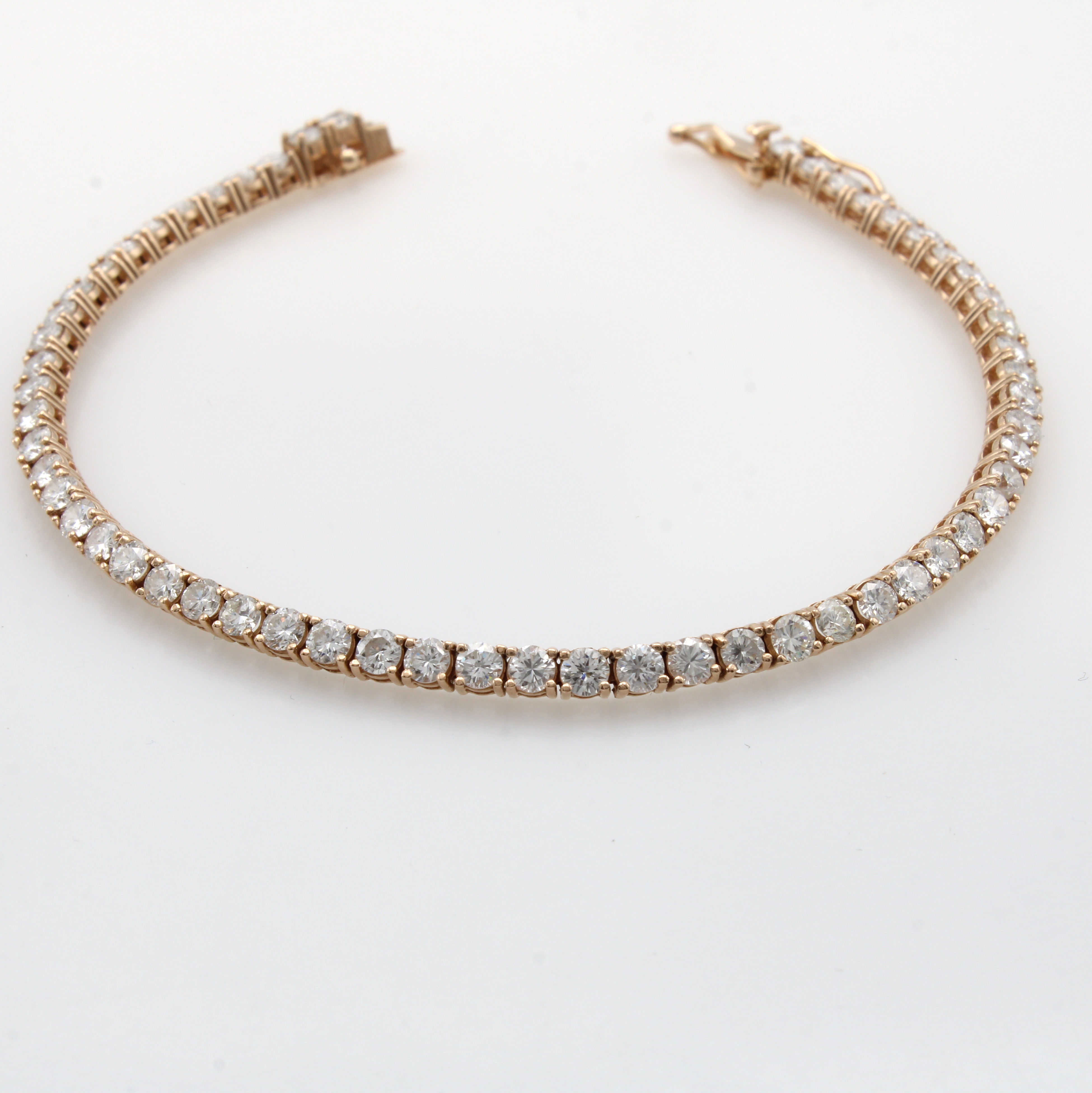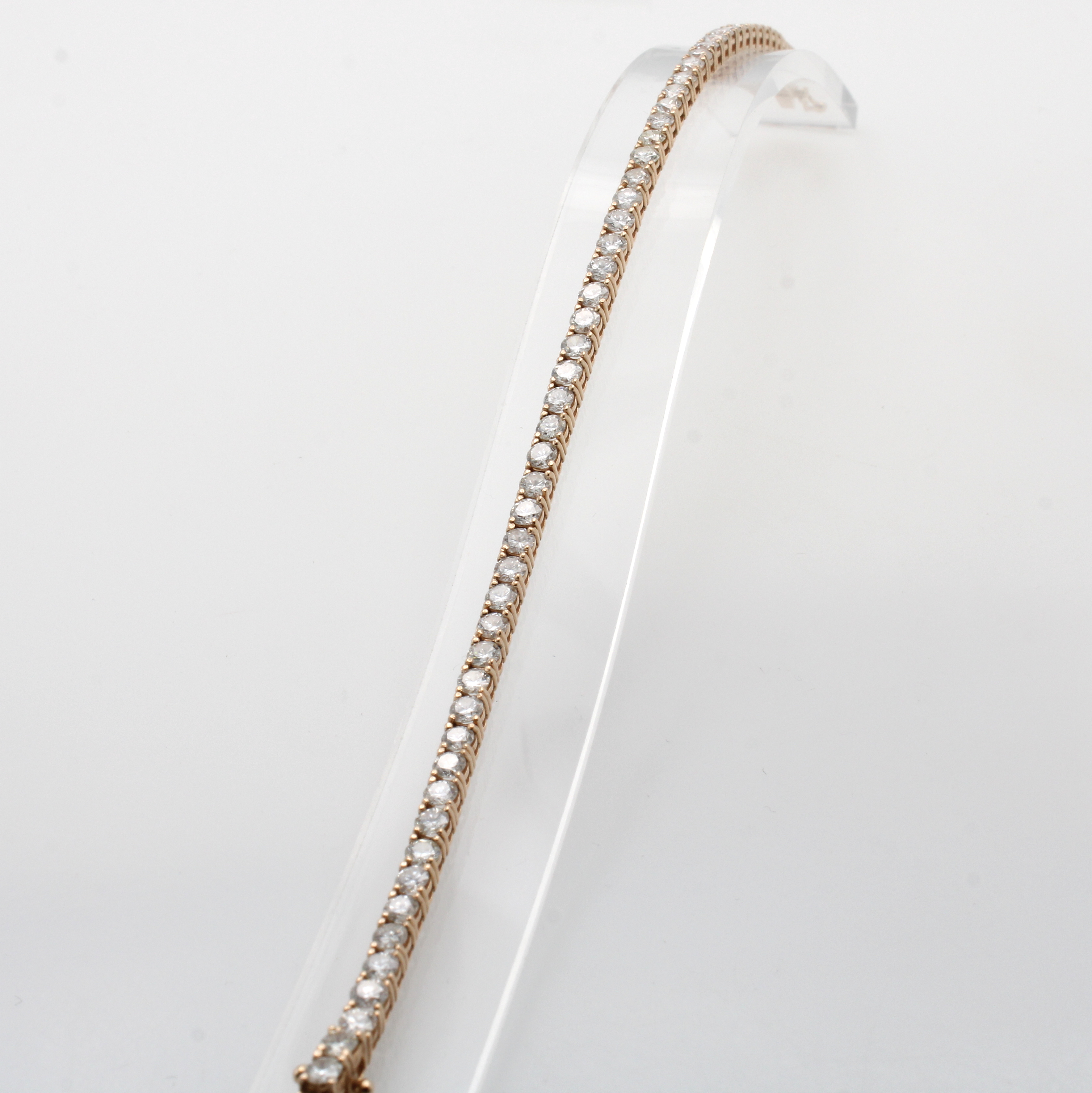 Rivierarmband mit Brillanten, RG 585/000, 57 Brill. zus. ca. 5.02 ct feines Weiß-Weiß- lupenrein-si, Kastenschl. m. Sicherheitsacht, L. ca. 18 cm Schätzpreis: 10000, - EUR