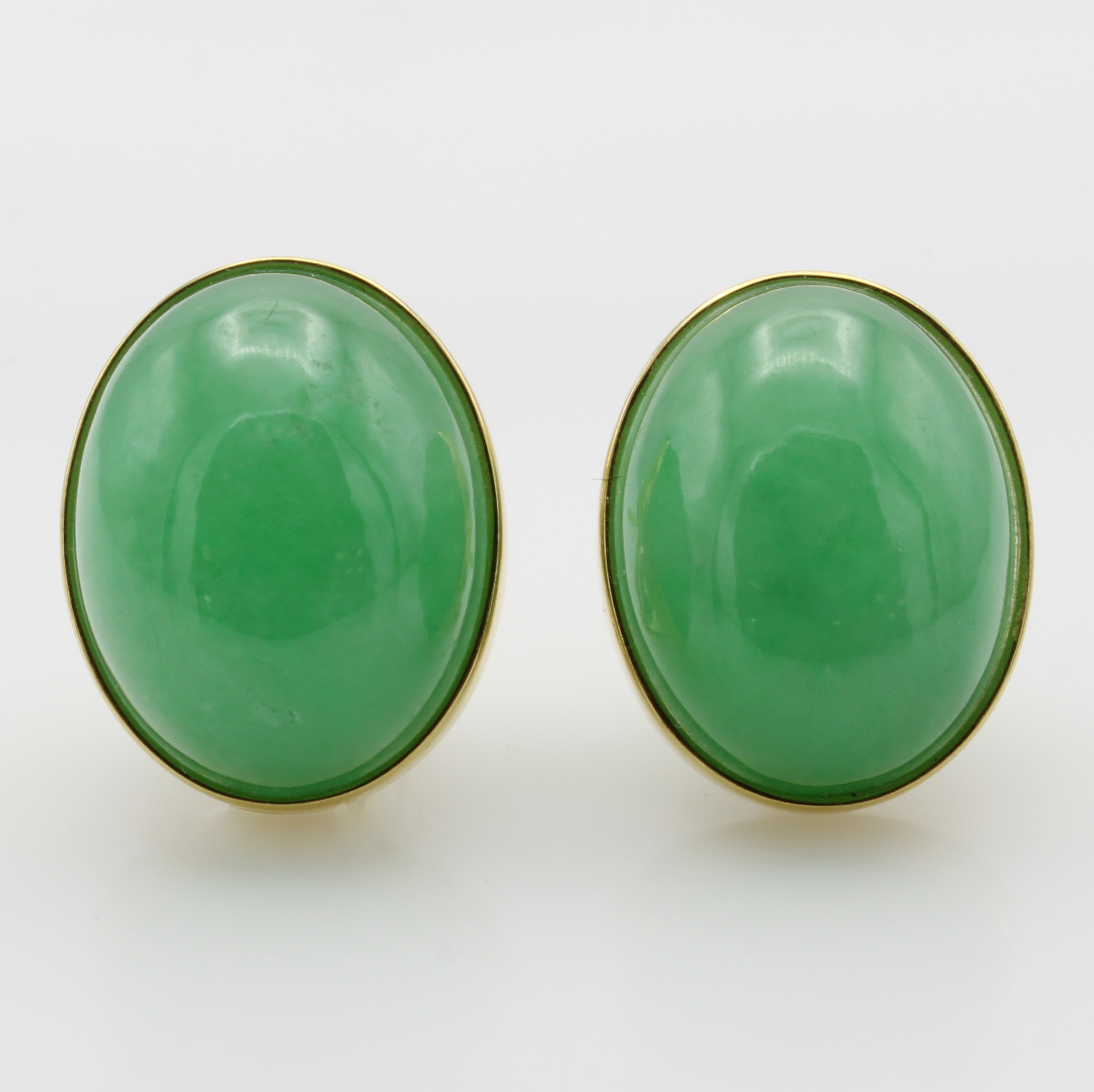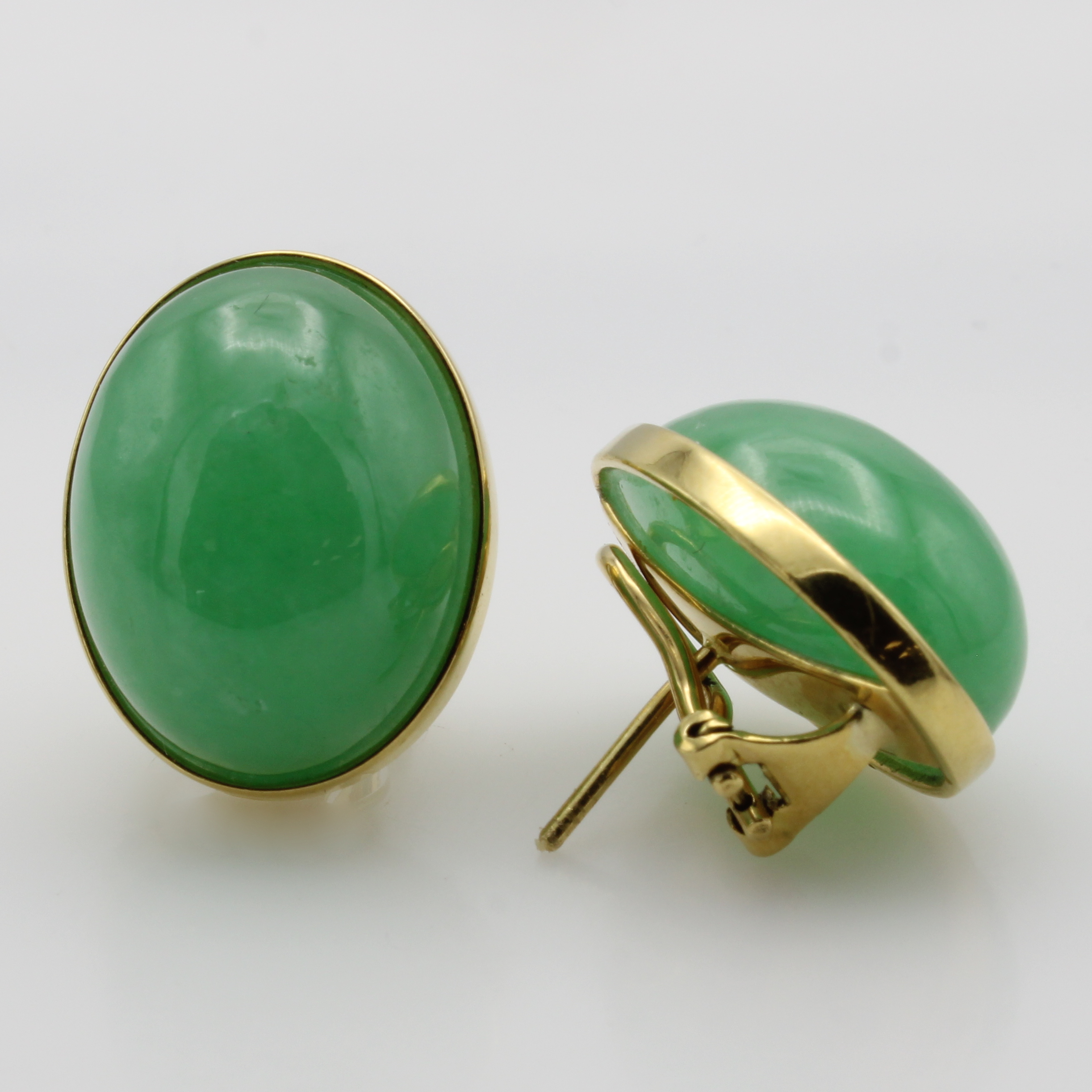 Paar Ohrstecker mit Jade, GG 750/000, Jade- cabochons, Handarbeit, m. Clipbrisur, Maße ca.2x1.5 cm Schätzpreis: 6800, - EUR