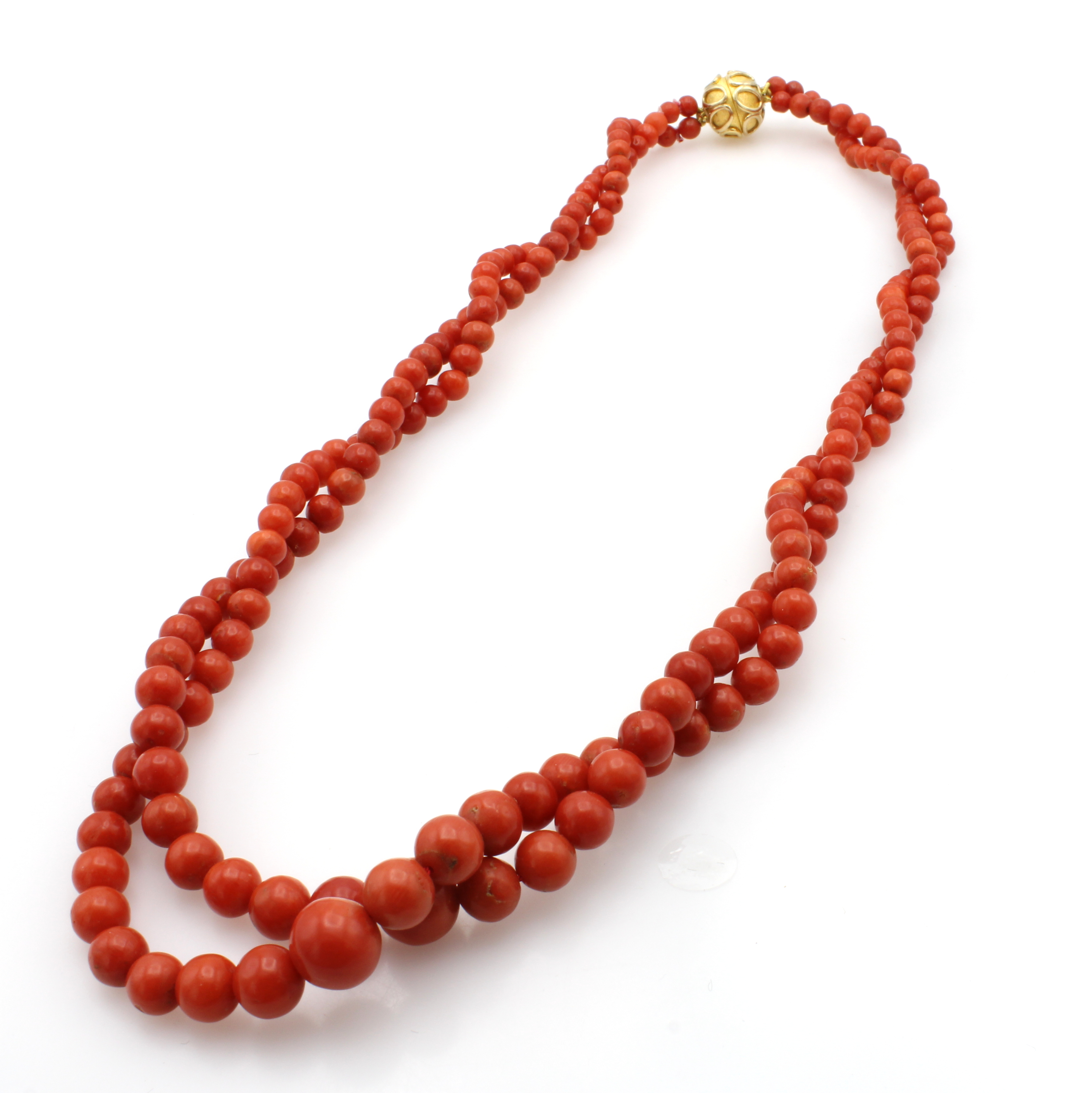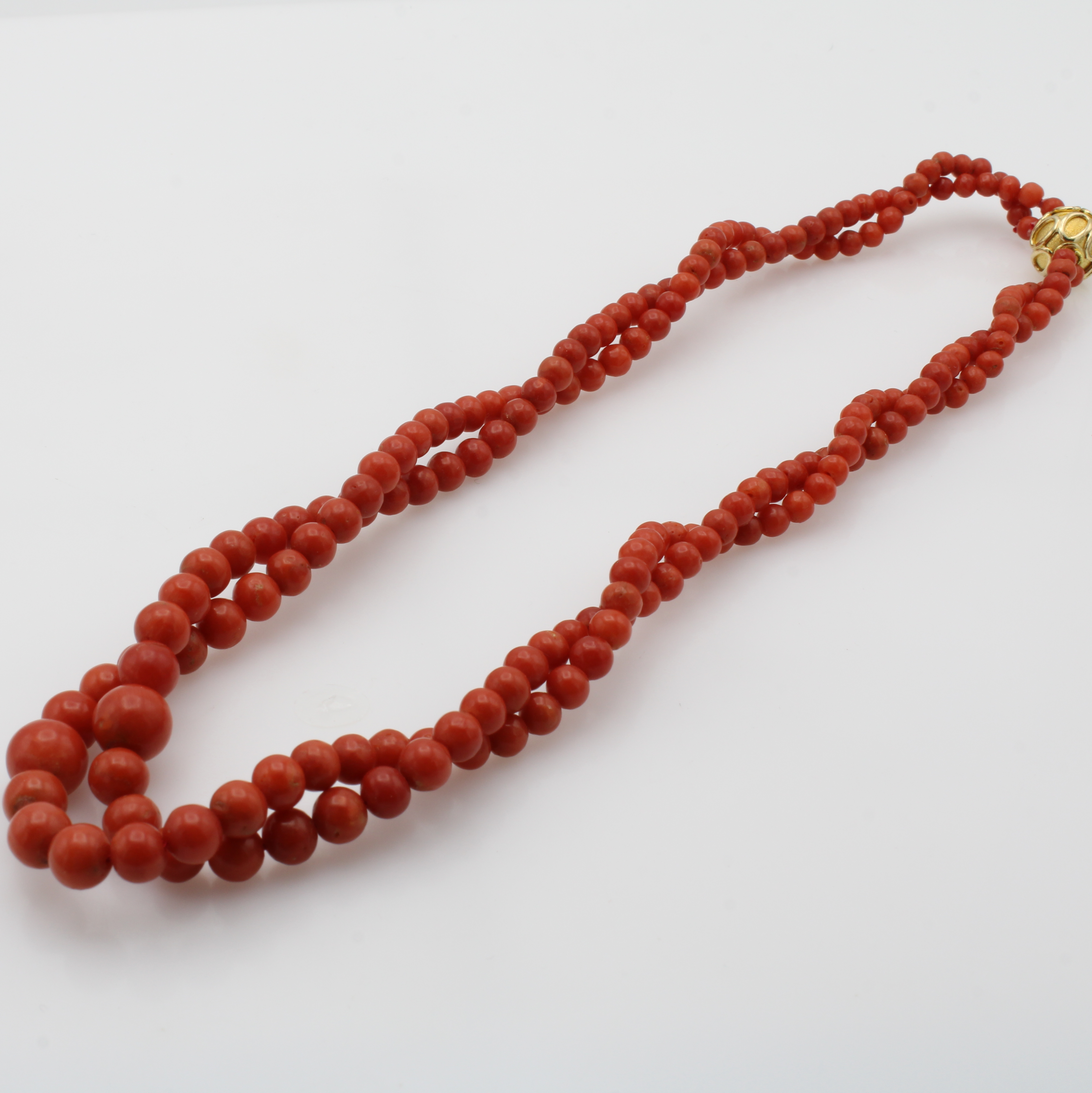 2-reihige Korallkette, Magnetschl. 925er Silber verg., D. ca. 4.2-10 mm, L. ca. 47 cm Schätzpreis: 4200, - EUR