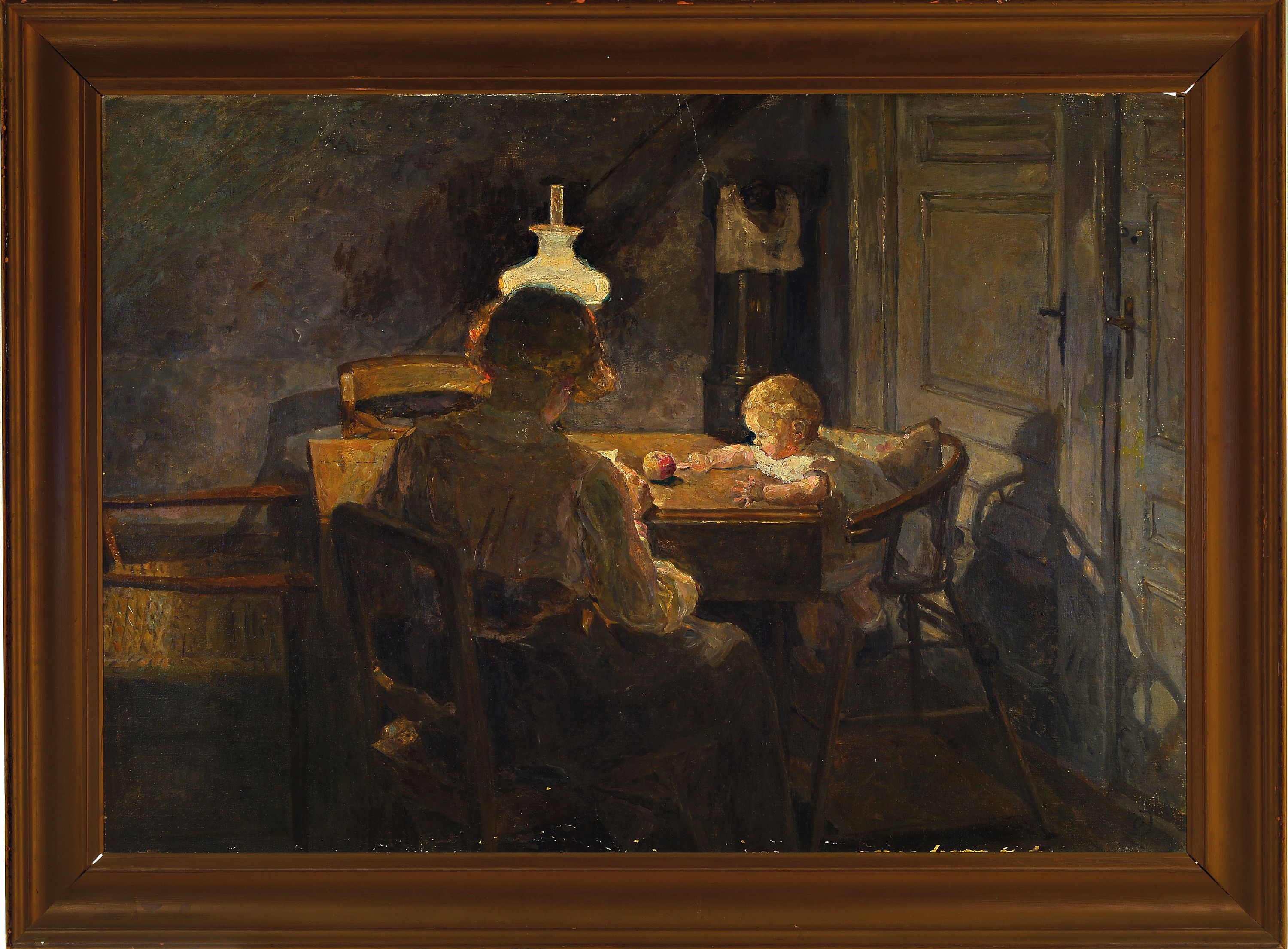 Olga Jensen, 1877-1949, Mutter mit Kind am Tisch sitzend, Öl/Lwd, rechts unten monogr.,