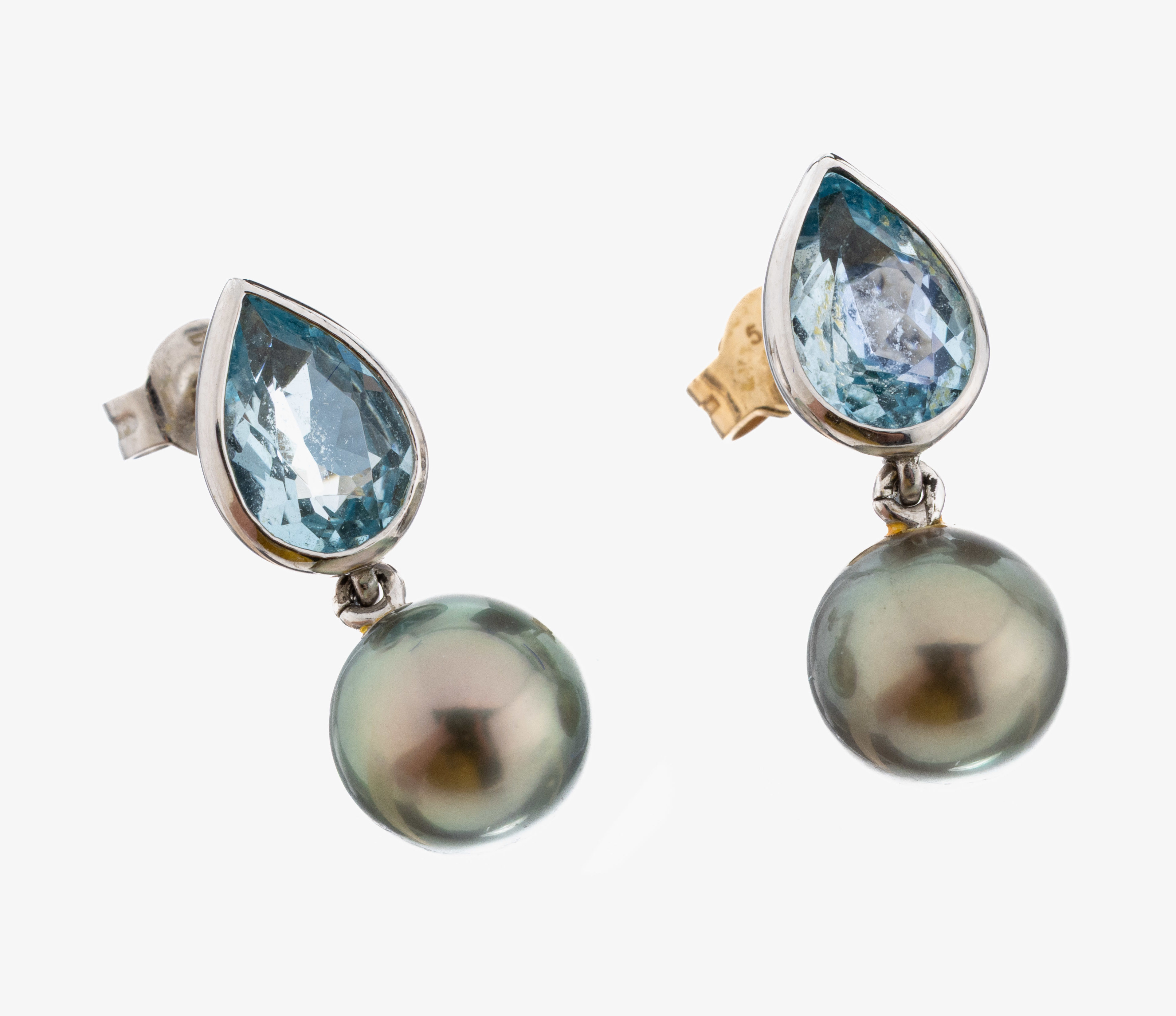 Paar 14 kt Gold Topas-Perl-Ohrstecker, WG 585/000, schlichtes Design, 2 facett. Blautopastropfen