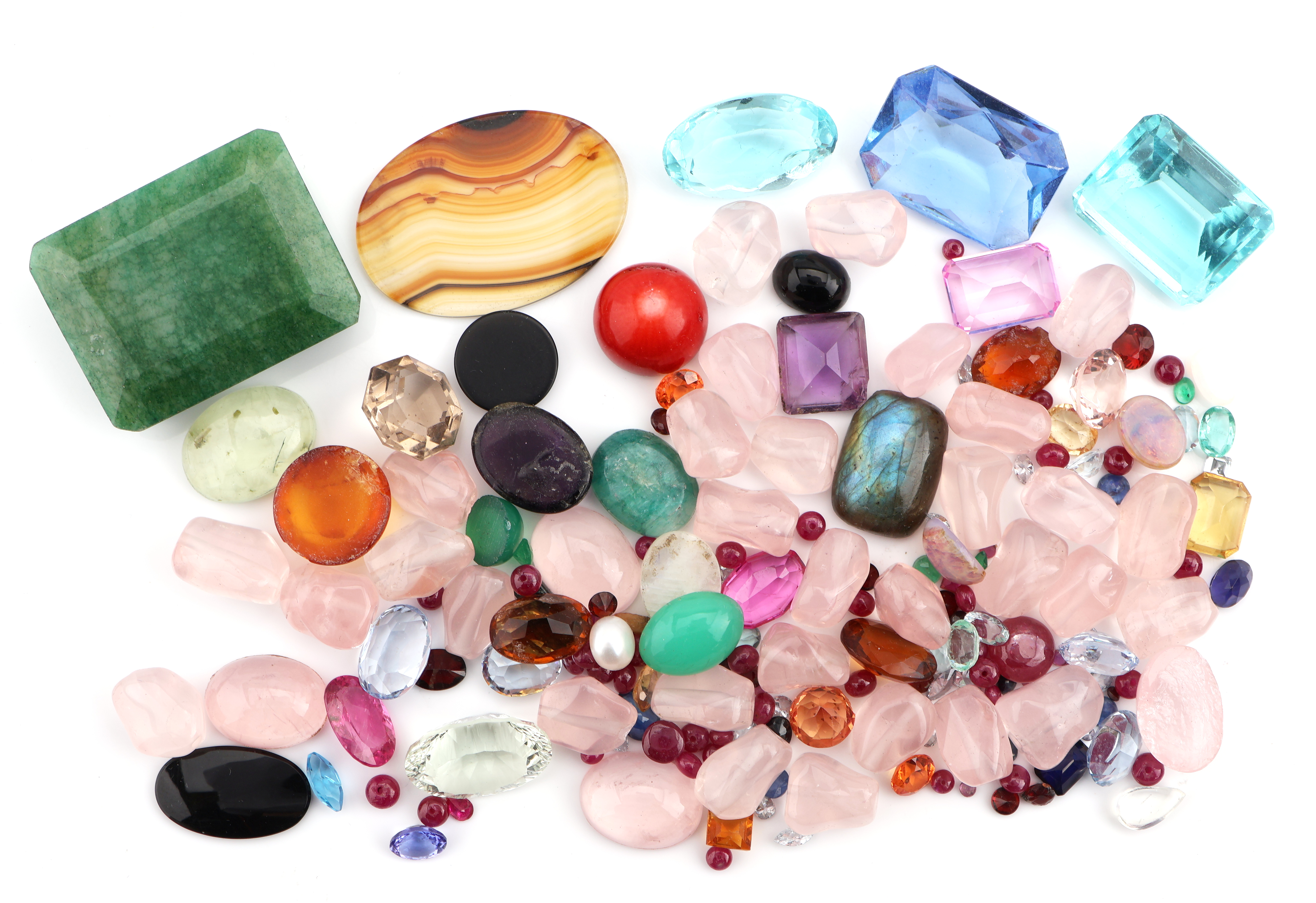 Größen, gebohrte Rosenquarze in versch. Formen, Saphire, Rubine, Smaragde, Blautopase