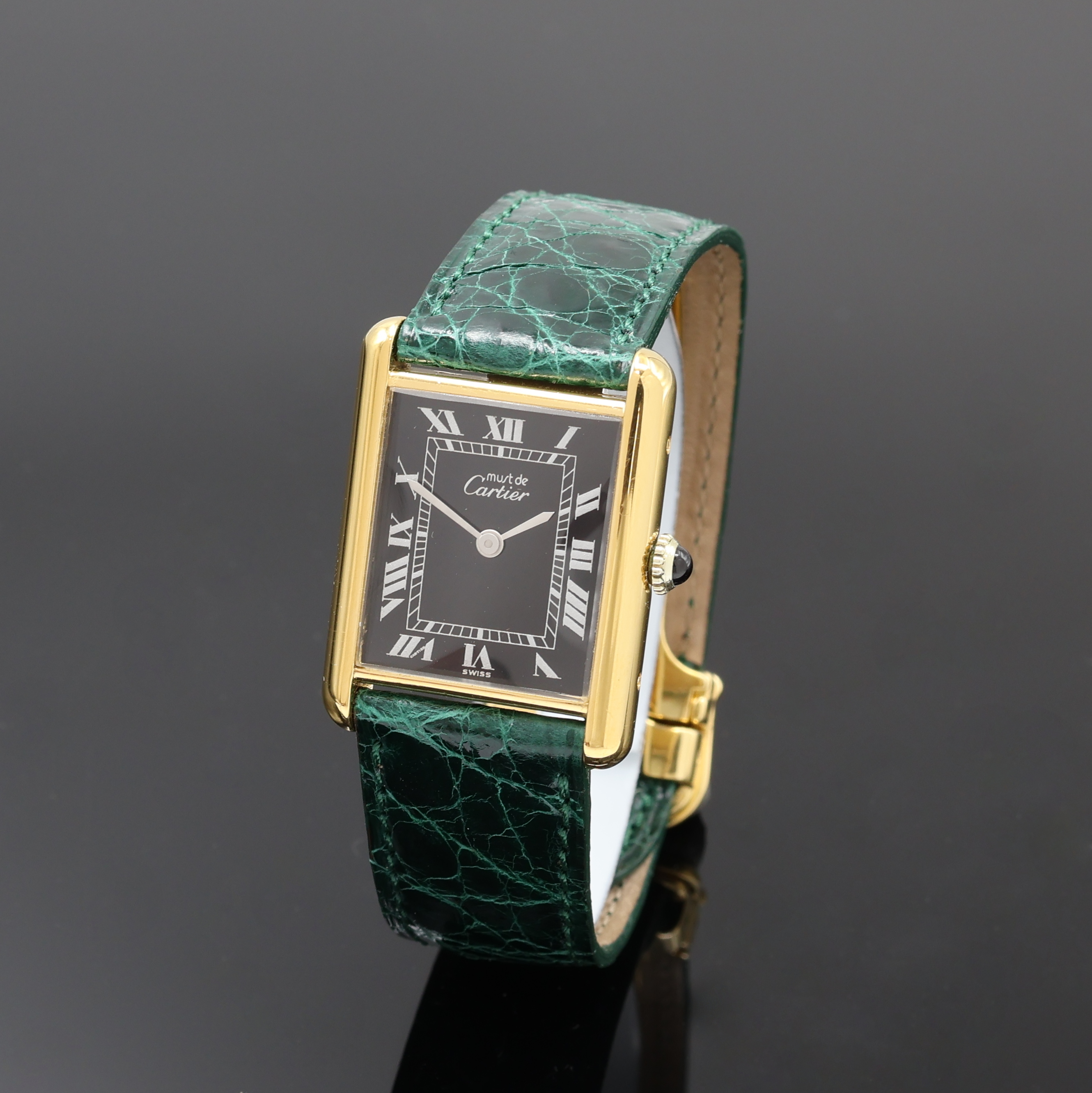 CARTIER Tank Armbanduhr, Handaufzug, verg. Geh. in 925er Silber seitl. verschr., orig. Lederband m. verg. Faltschl., Schmuckkrone, schwarzes Zifferbl. m. röm. Zahlen, weiße Zeiger, M. ca. 31 x 23 mm, EZ 2