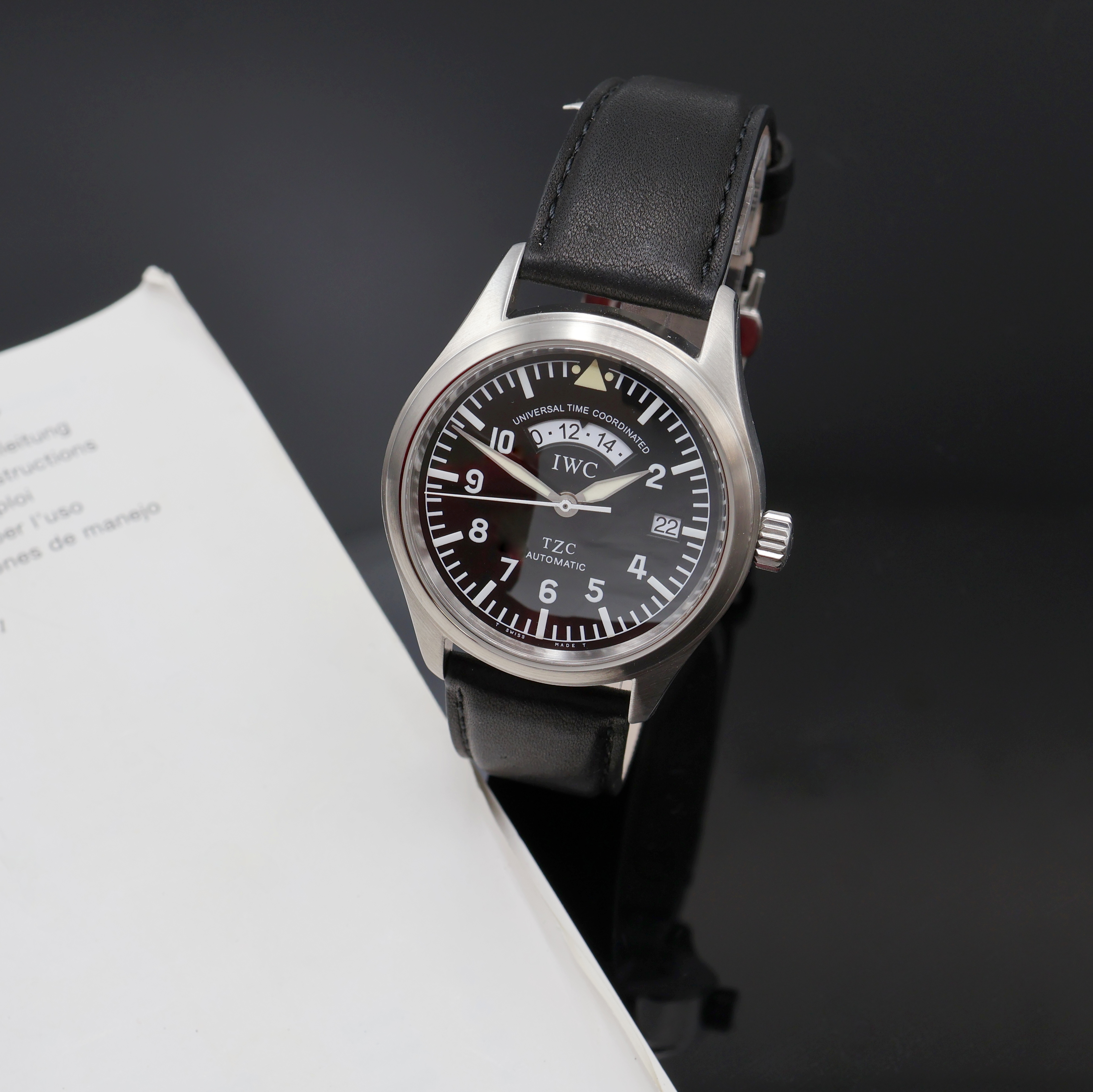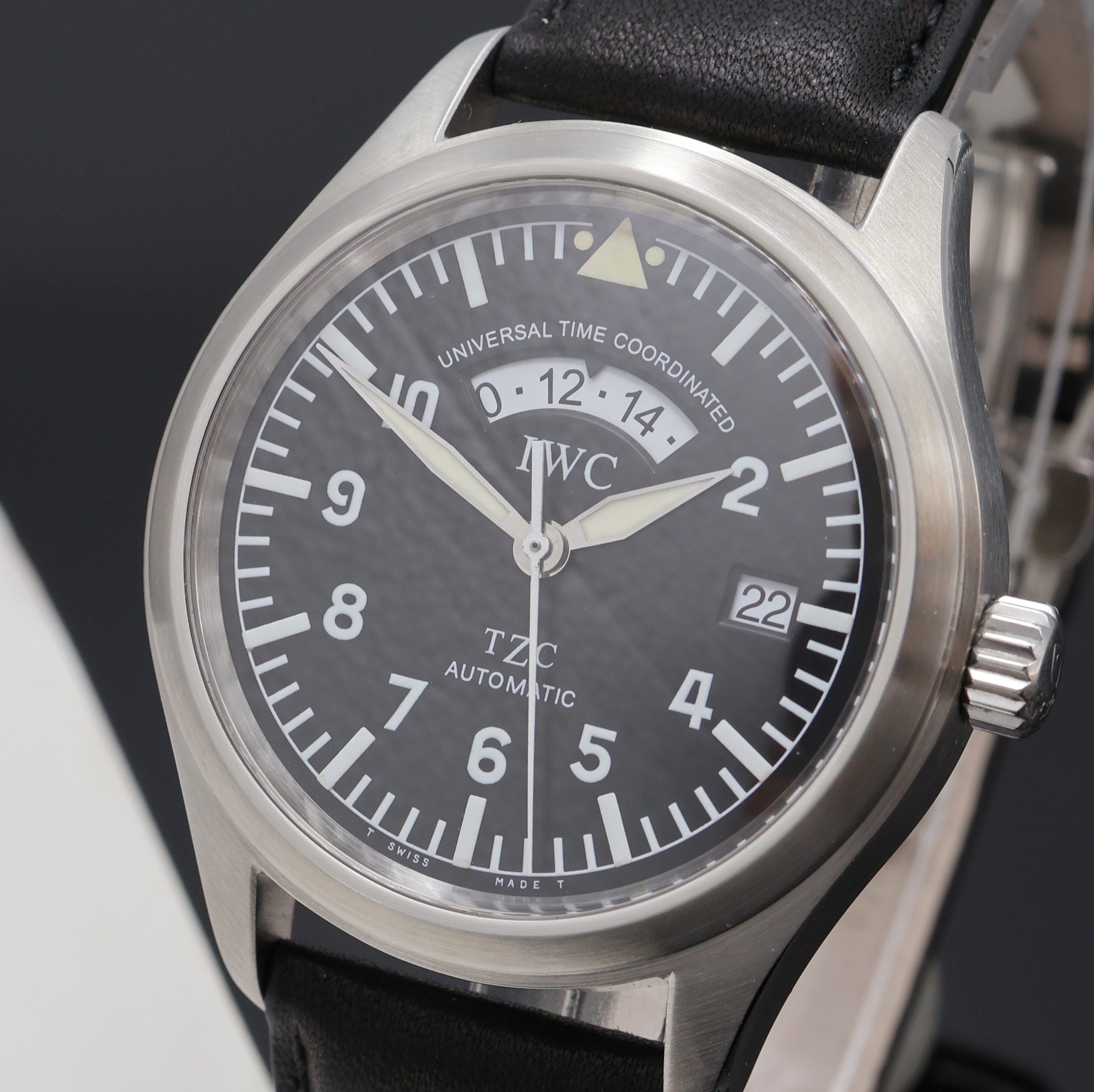 IWC Fliegeruhr Spitfire UTC Herrenarmbanduhr Referenz 3251, Automatik, Edelstahlgeh., Boden u. Krone verschr., schwarzes Zifferbl. m. Leuchtind. u. Leuchtzeigern, Datum b. 3, D. ca. 39 mm, Pap. anbei, EZ 2