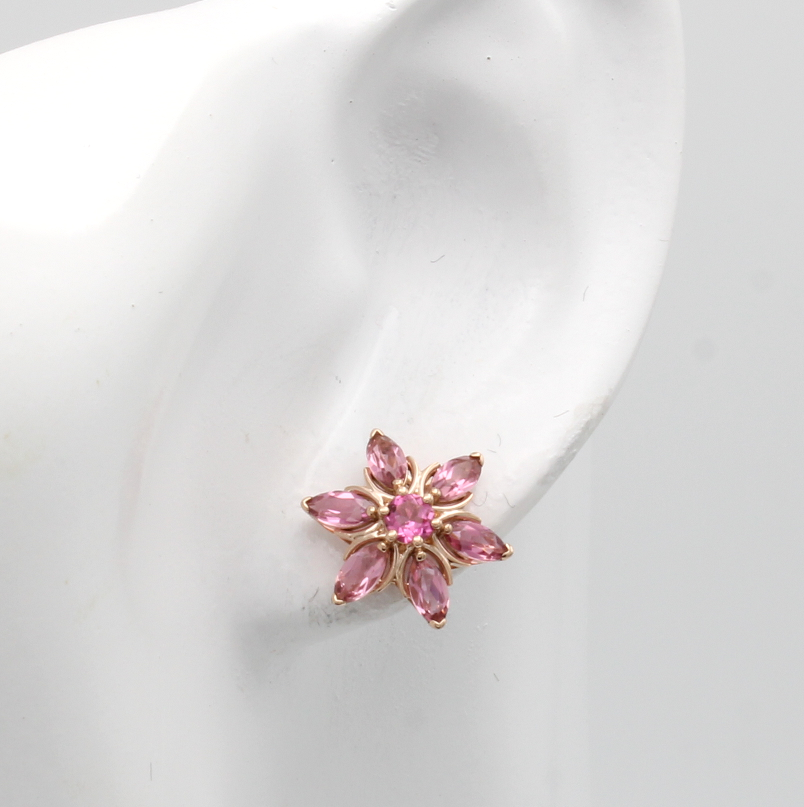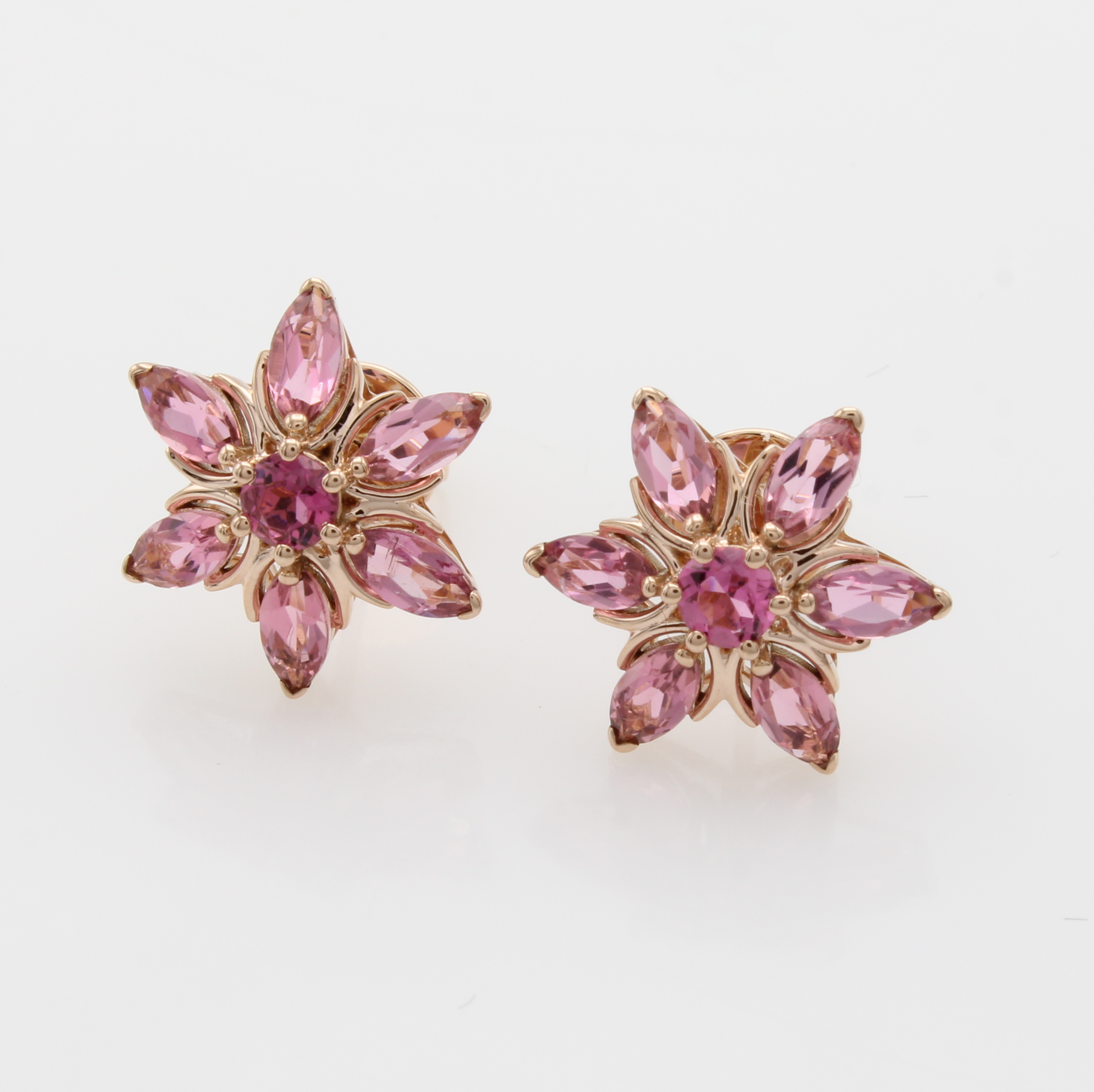Paar Ohrstecker mit Turmalinen, RoséG 585/ 000, 14 roséfarb. Turmaline zus. ca. 2.14 ct in Blütenform Schätzpreis: 1570, - EUR