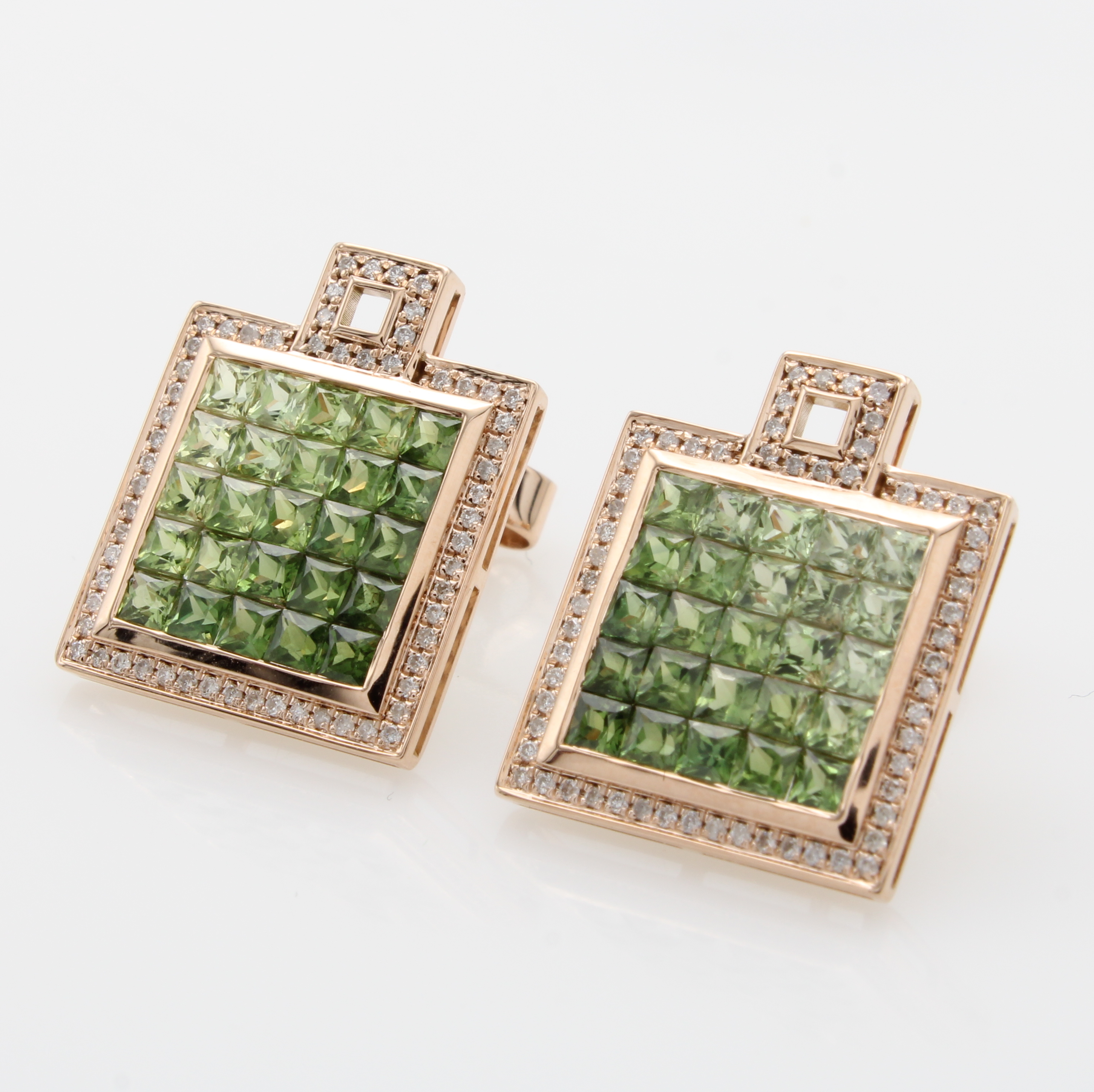 Paar Ohrstecker mit Brillanten und Saphiren, RoséG 585/000, 122 Brill. zus. ca. 0.27 ct feines Weiß/vs-si, 50 Saphircarrées in versch.Grüntönen Schätzpreis: 3600, - EUR