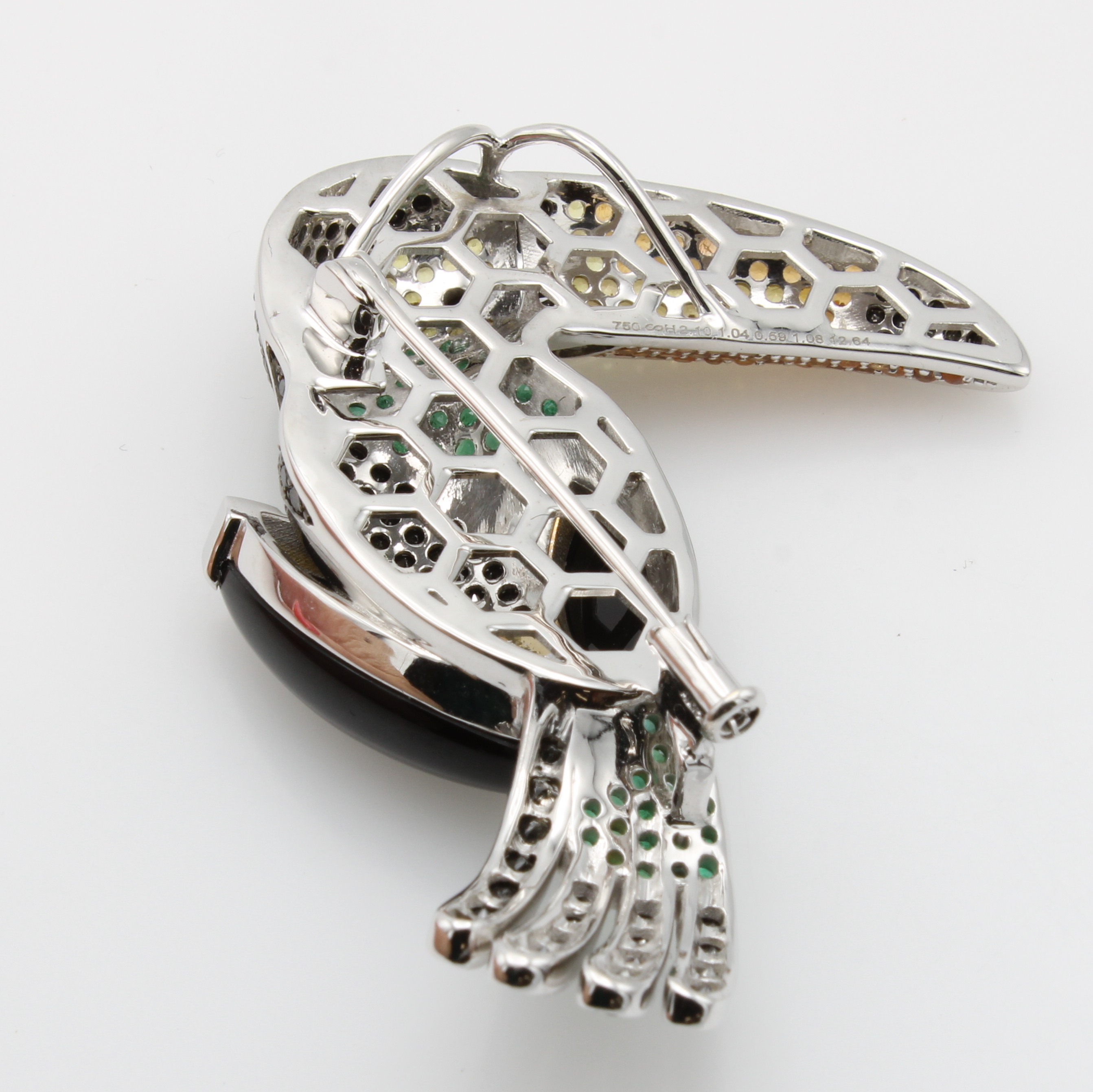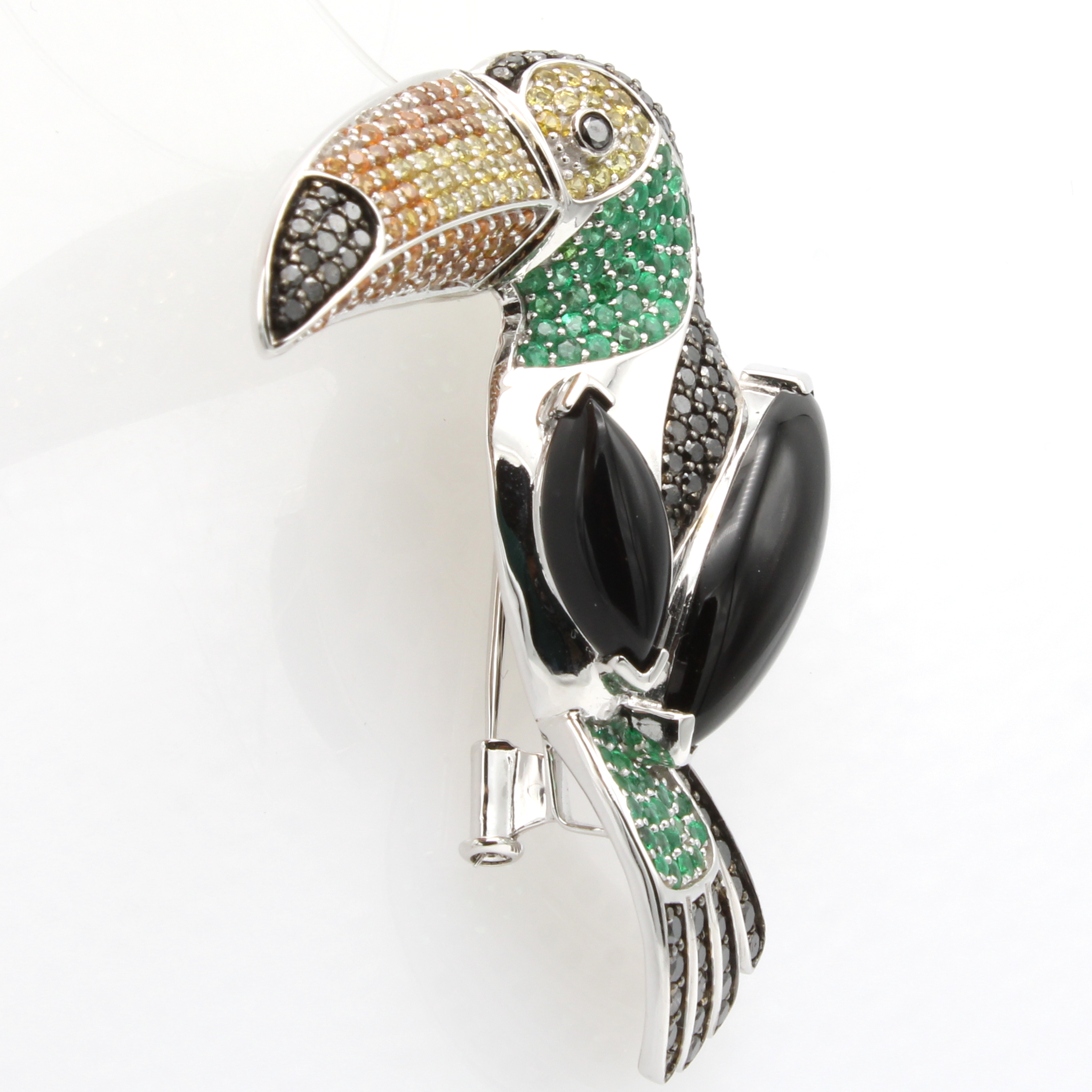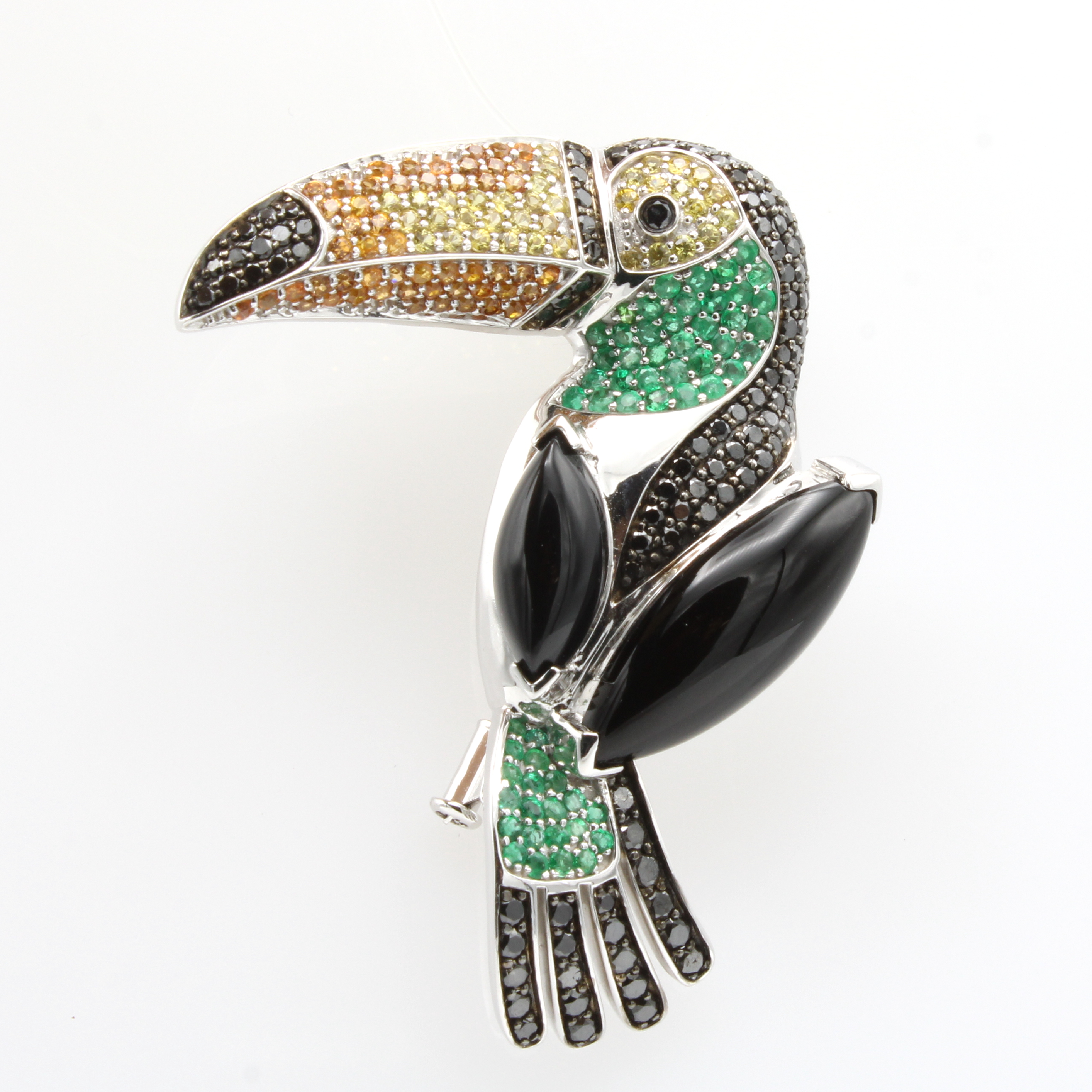 Anhänger/Brosche "Tukan" mit Farbsteinen und Diamanten, WG 750/000, 2 Onyxe zus. ca. 12.64 ct, 57 Smaragde zus. ca. 1.04 ct, 52 Mandarin Granate zus. ca. 1.08 ct, 36 Saphire in versch. Farben zus. ca 0.59 ct, 117 Diam. zus. ca. 2.10 ct schwarz (beh.) Schätzpreis: 7900, - EUR