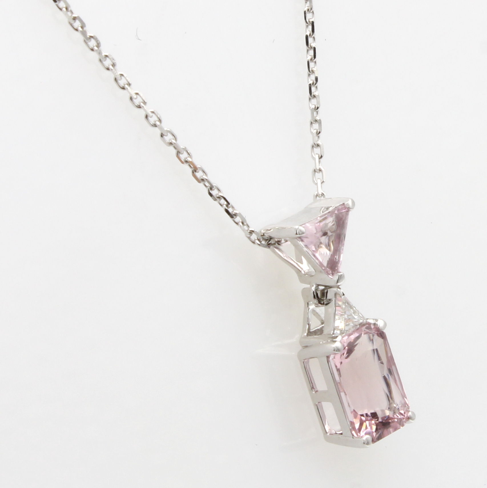 Anhänger mit Morganiten und Brillant an Kette, WG 585/000, Brill. ca. 0.12 ct feines Weiß/p1, 2 Morganite zus. ca. 2.30 ct, in L. ca. 42 u. 45 cm tragbar Schätzpreis: 1800, - EUR
