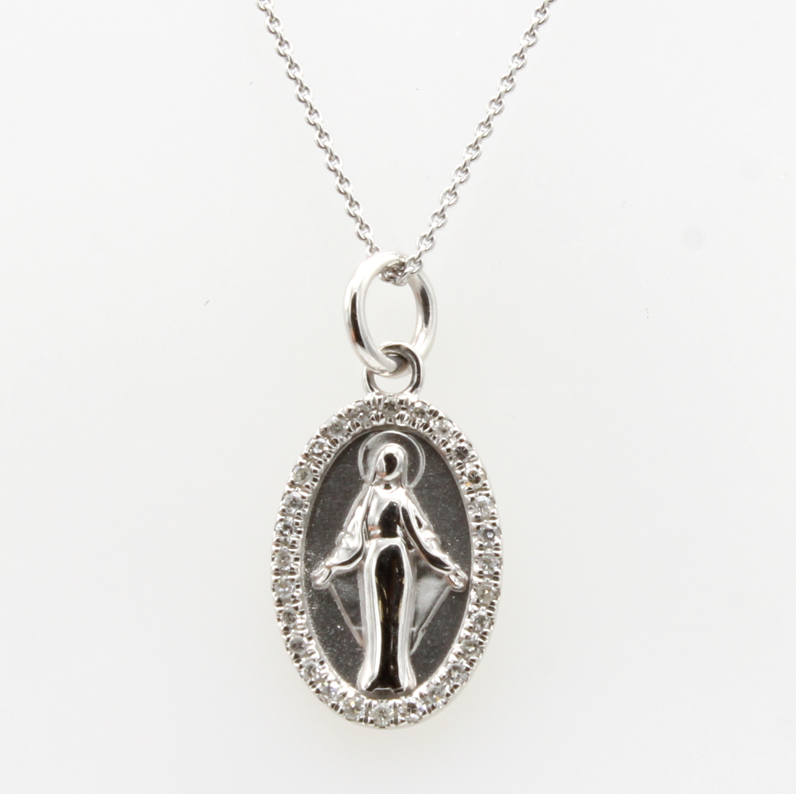 Anhänger "Madonna" mit Brillanten an Kette, WG 585/000, 28 Brill. zus. ca. 0.10 ct Weiß/ si-p, L. ca. 45 cm Schätzpreis: 1570, - EUR
