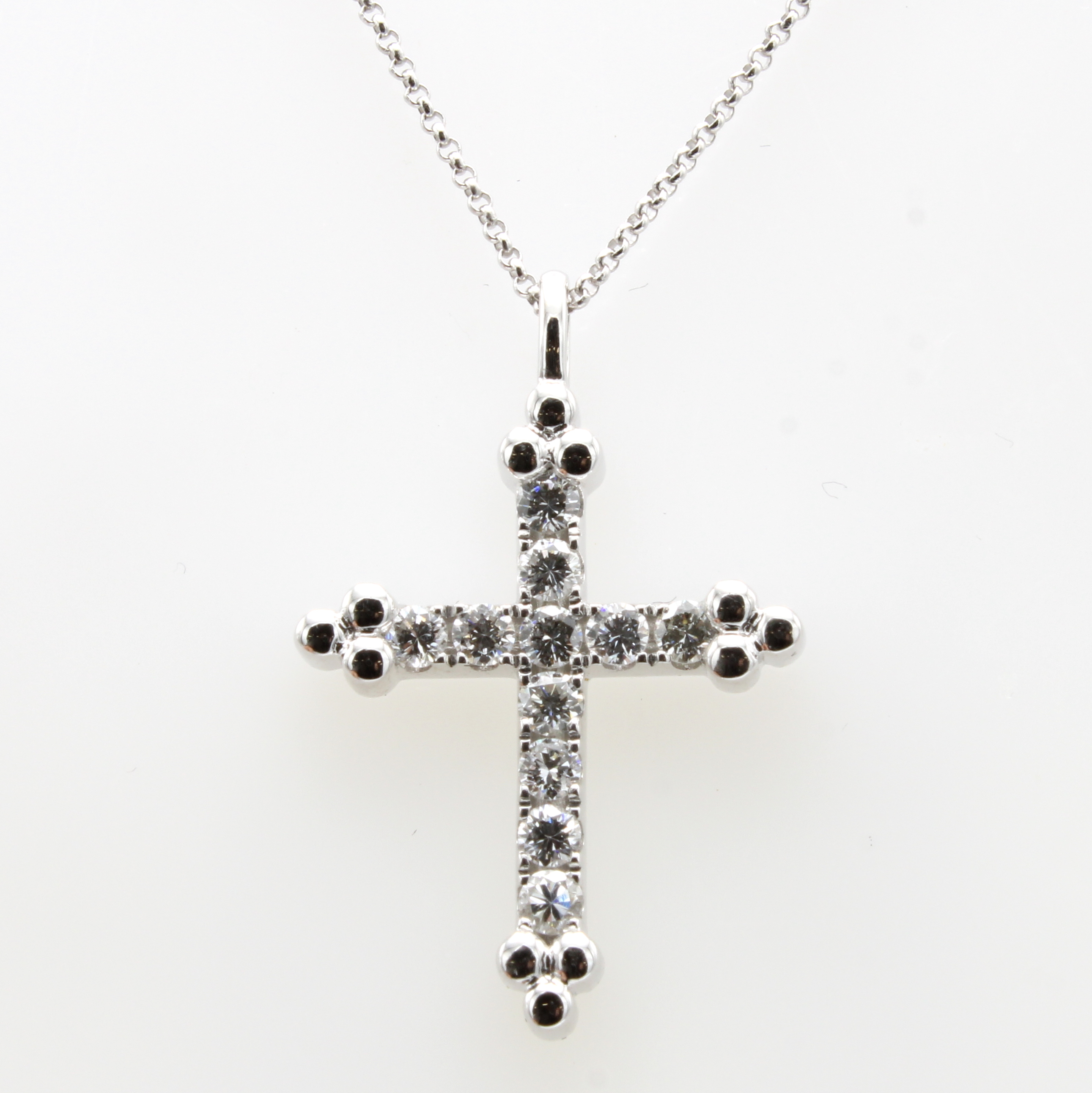 Kreuzanhänger mit Brillanten an Kette, WG 750/000, 11 Brill. zus. ca. 0.58 ct feines Weiß+/vvs-vs, in L. ca. 42 u. 45 cm tragbar Schätzpreis: 3300, - EUR