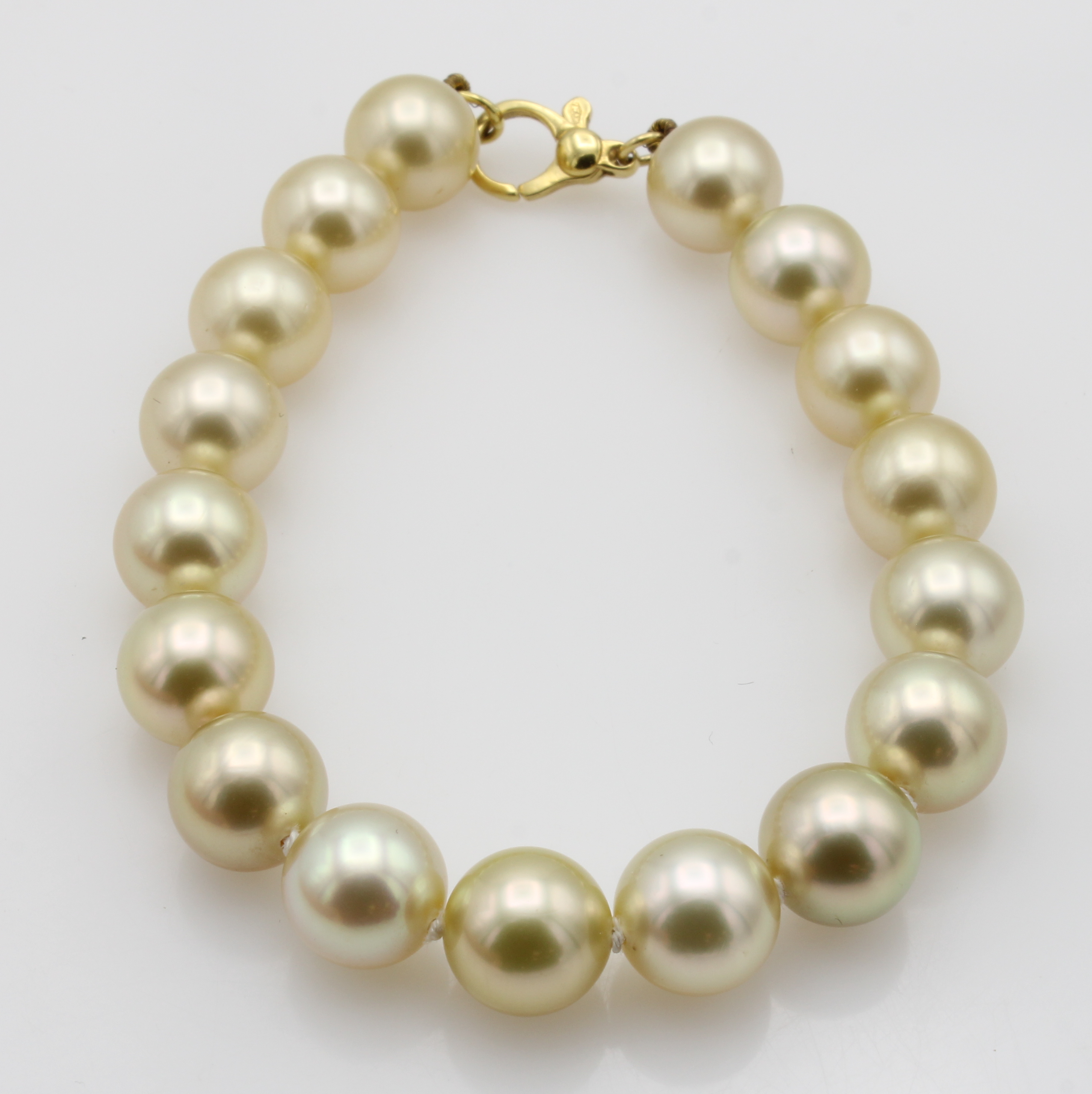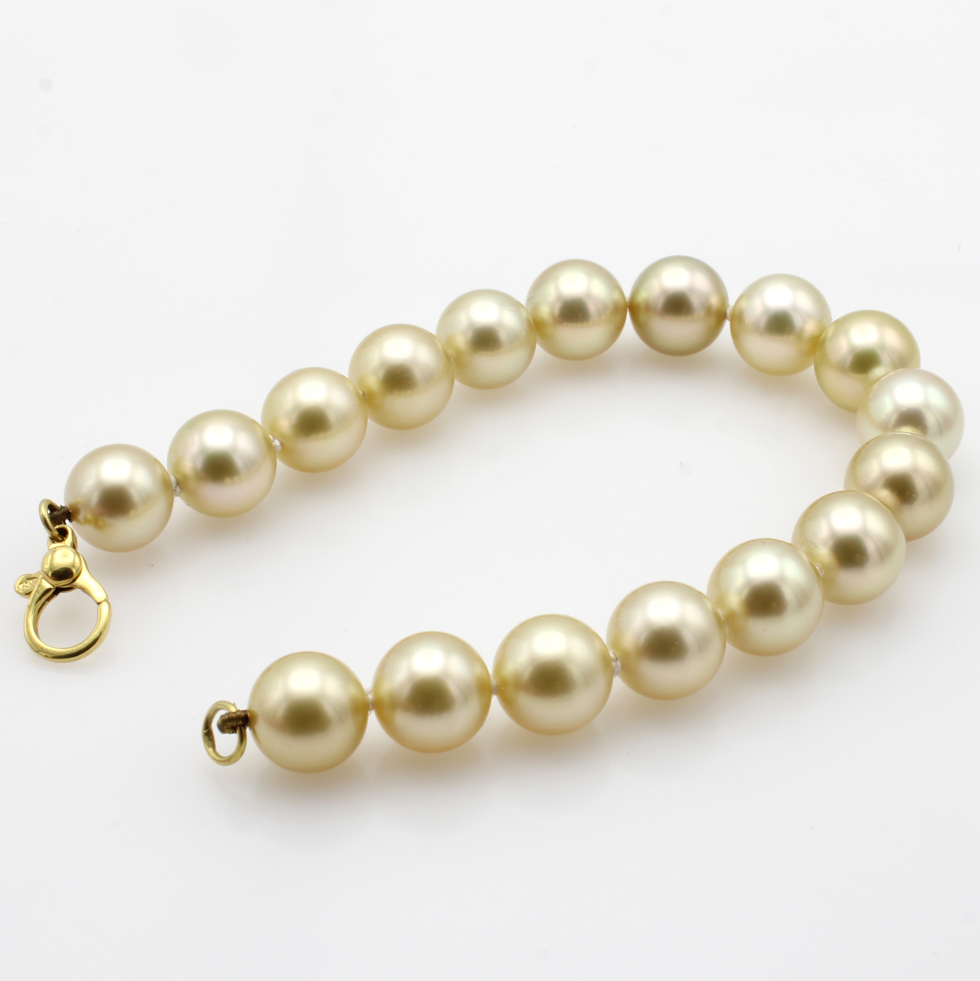Armband mit Südseezuchtperlen, Karabiner- schl. GG 750/000, 17 champagnerfarb. Perlen, D. ca. 10.4 mm, L. ca. 20 cm Schätzpreis: 3470, - EUR