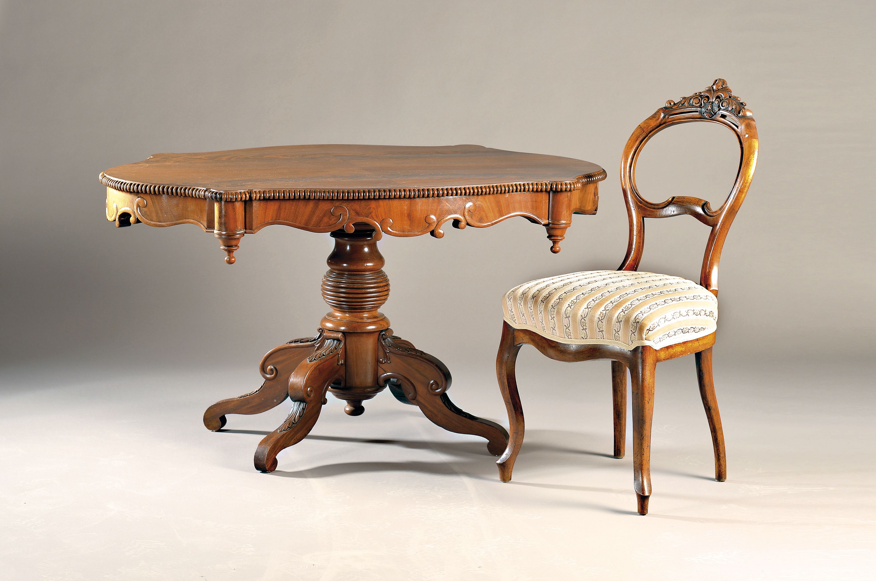 Tisch und vier Stühle, 19.Jh., Nussbaum massiv, Stühle an den Lehnen beschnitzt,