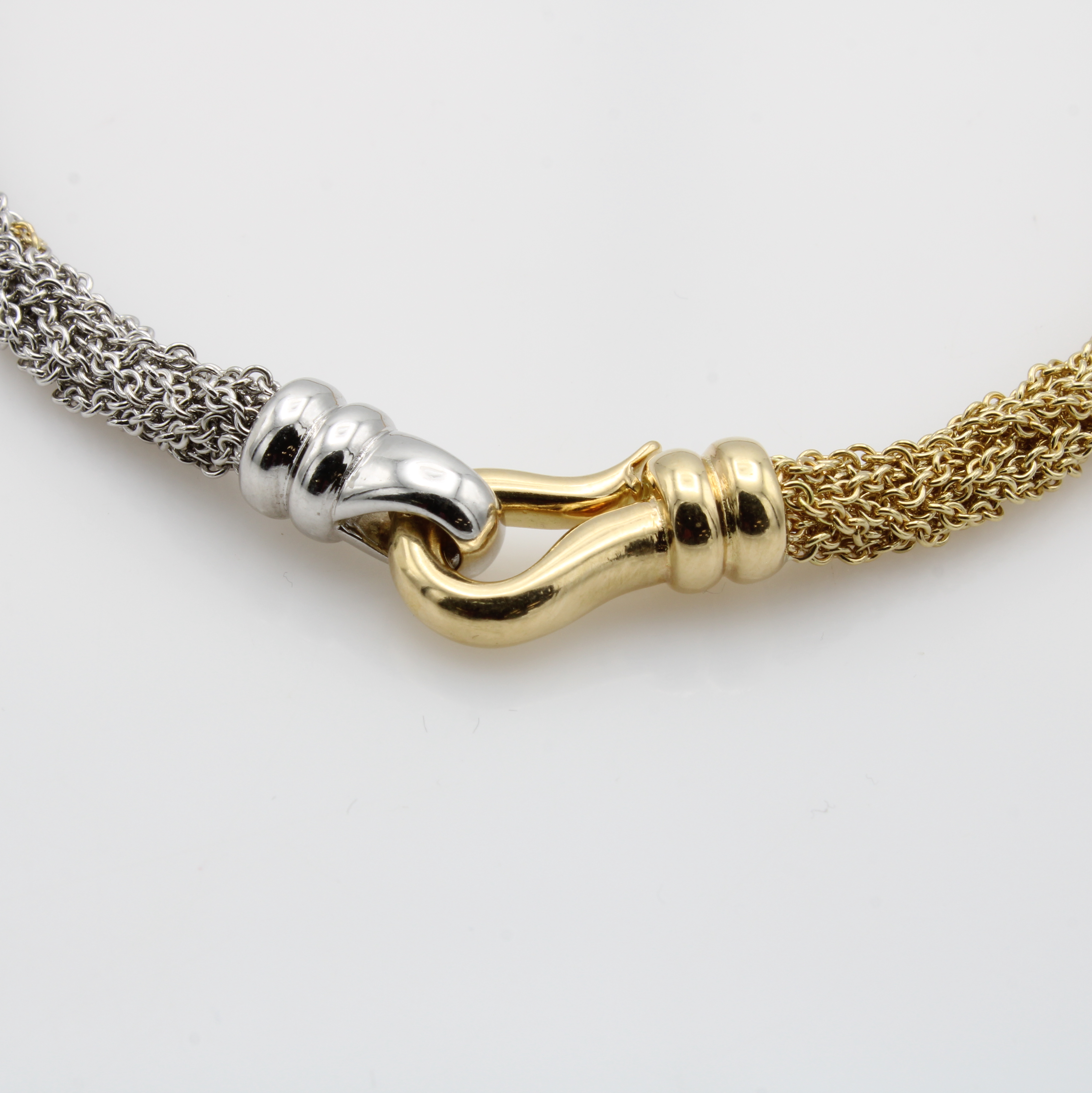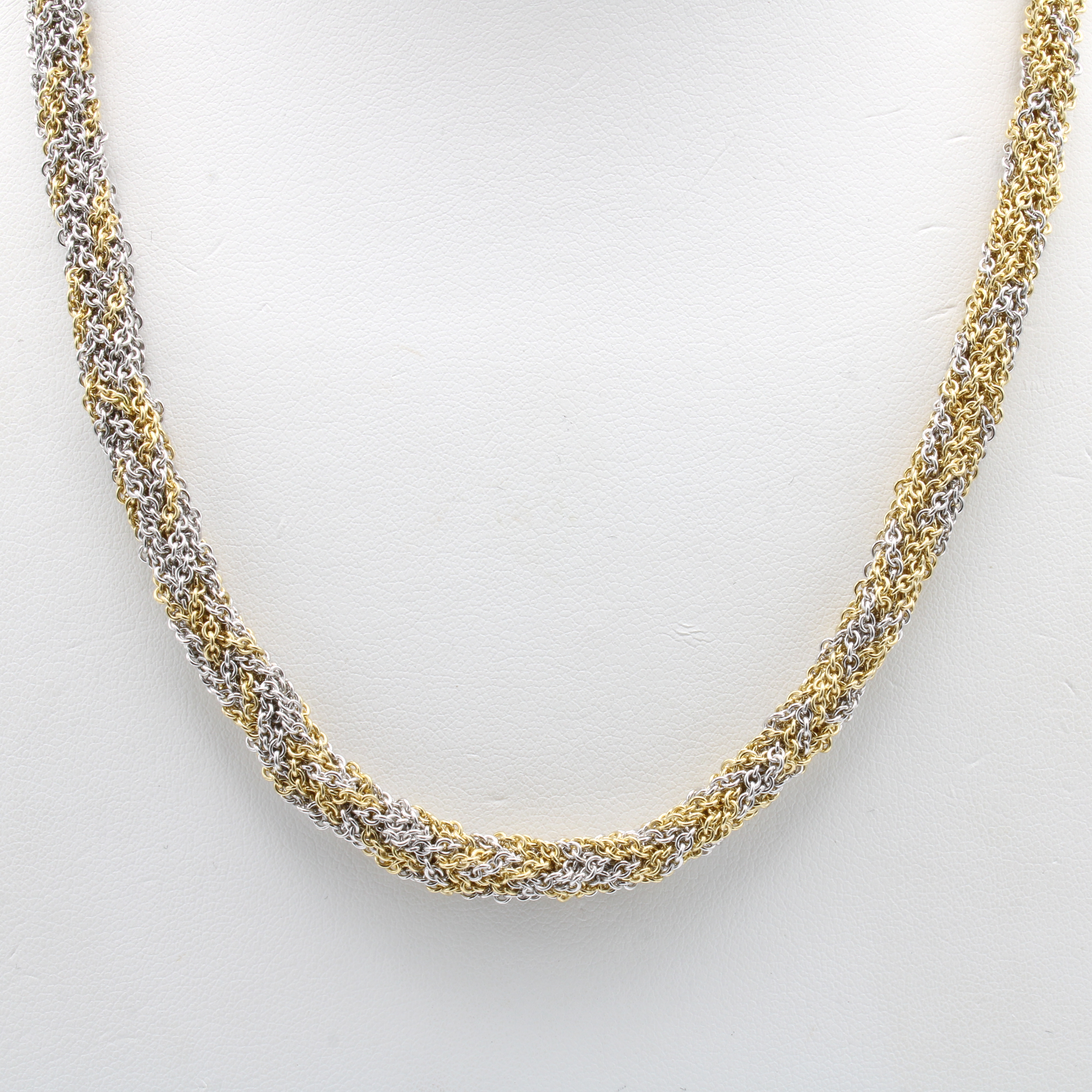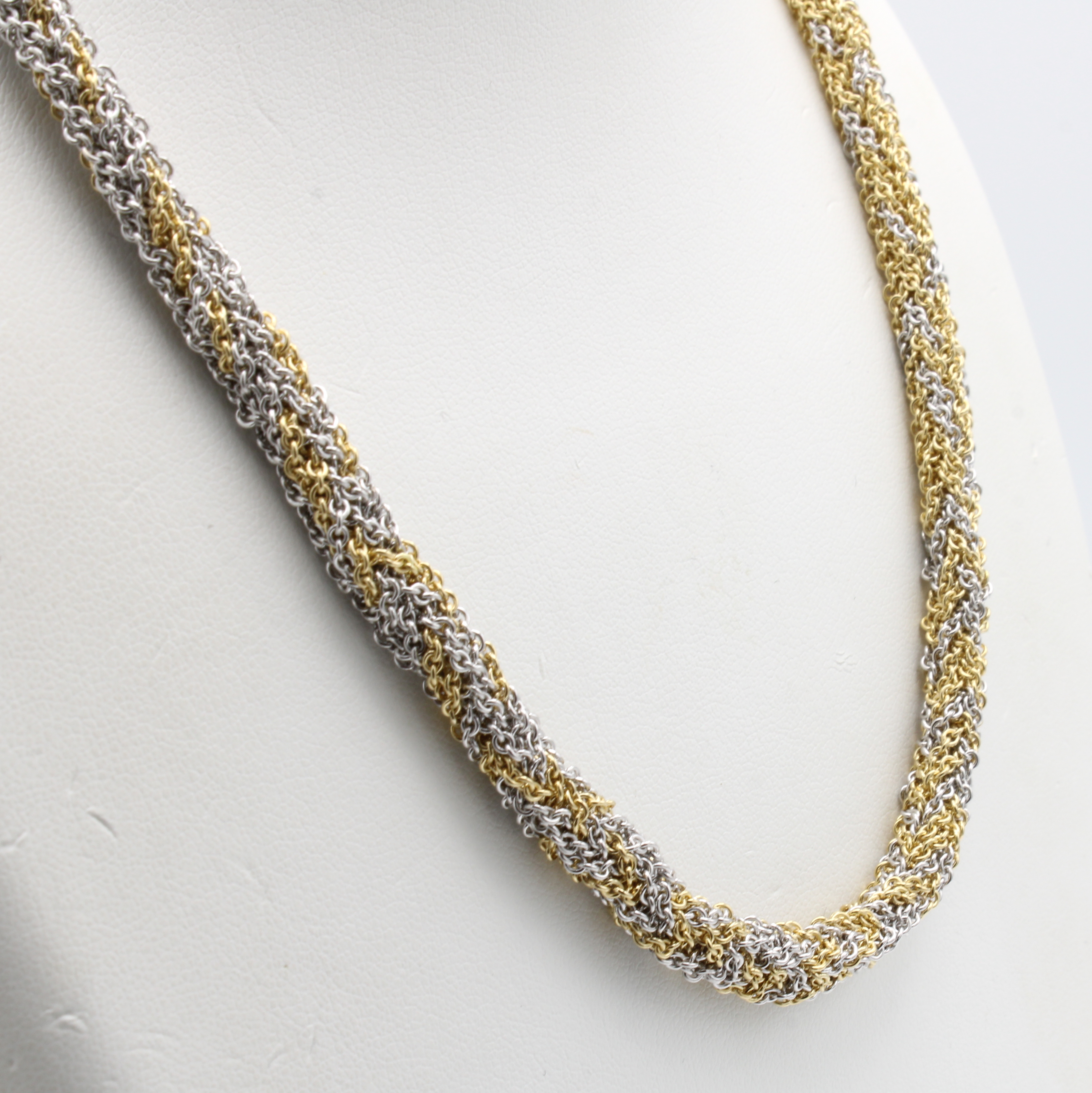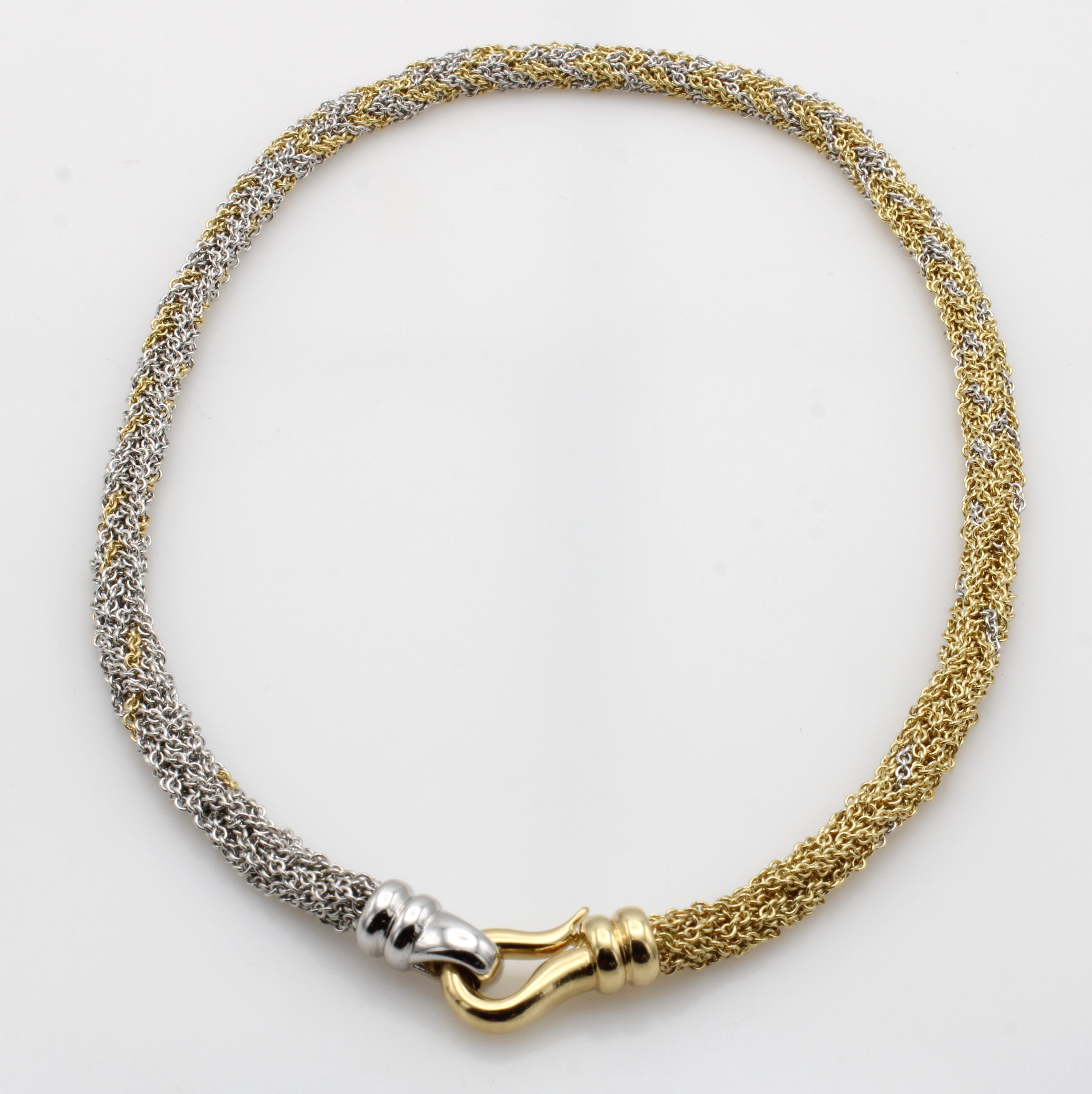 Collier aus verflochtenen Ankerketten, WG/GG 750/000, im WG/GG Farbverlauf, massive, aus- gefallene Ausführung, Hakenschließe, L. ca. 45 cm, massive Handarbeit aus Pforzheim