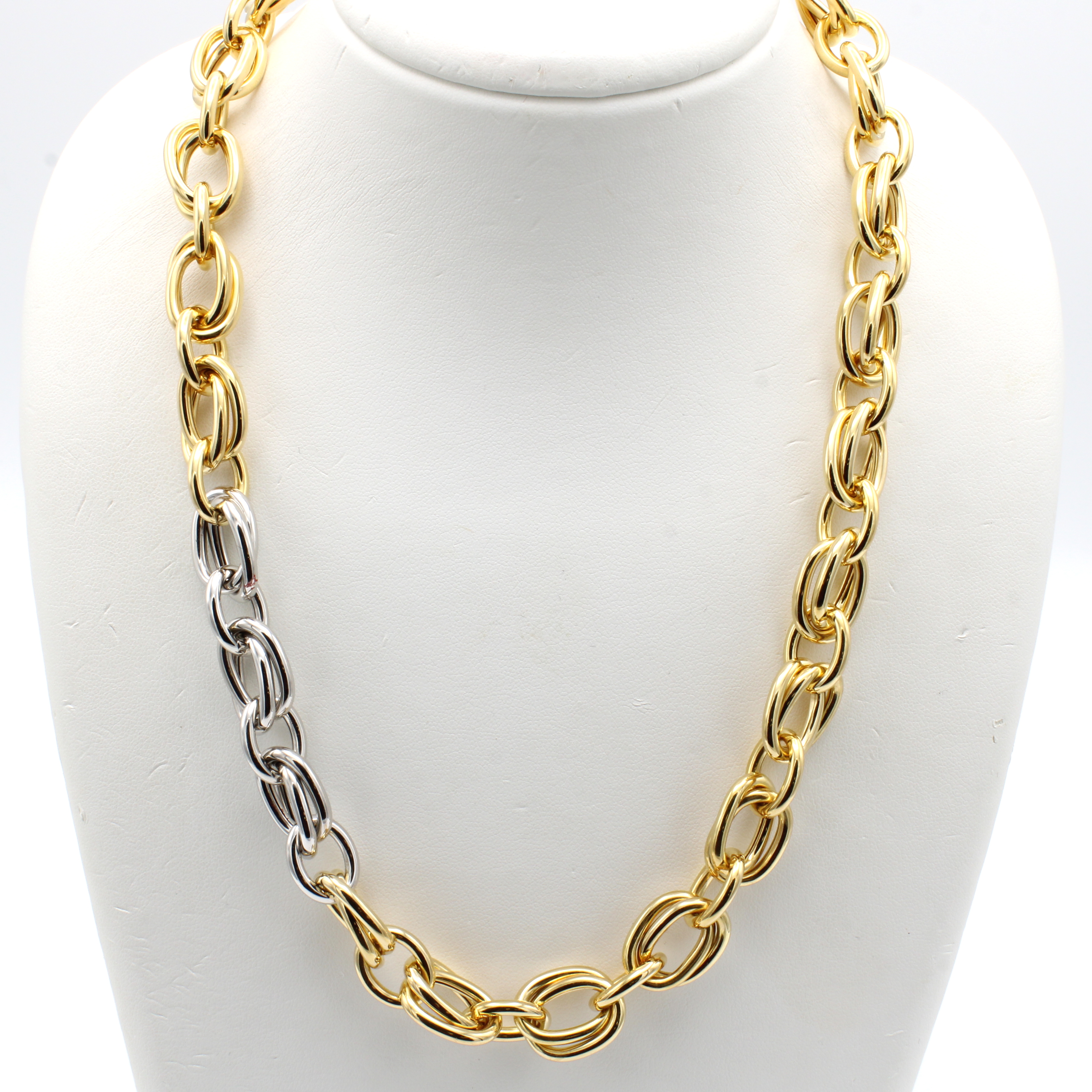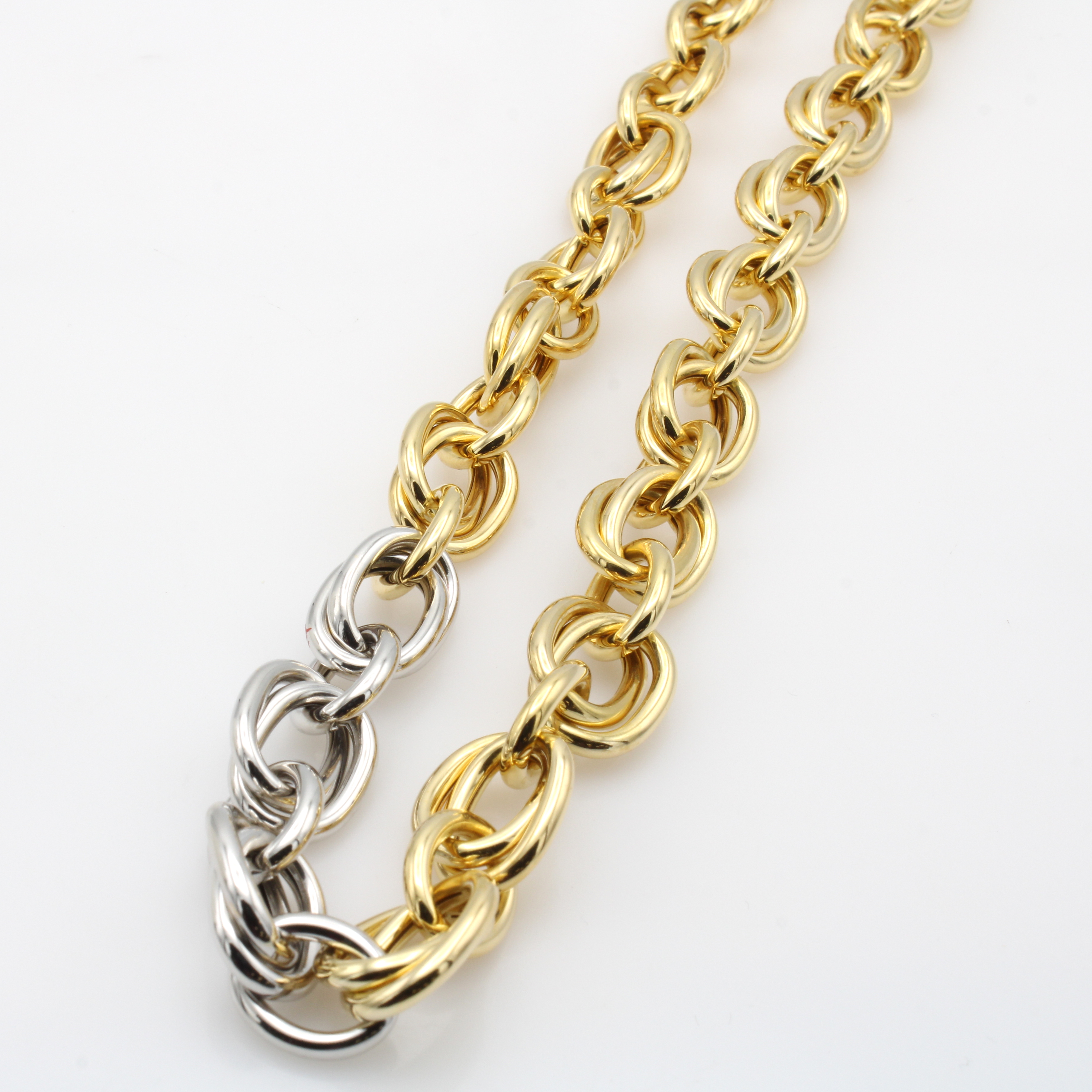 Collier, GG/WG 750/000, z.T. Zwillingsanker-glieder und 3 Glieder in WG Karabinerschl., L. ca. 50 cm, massive Handarbeit aus Pforz- heim