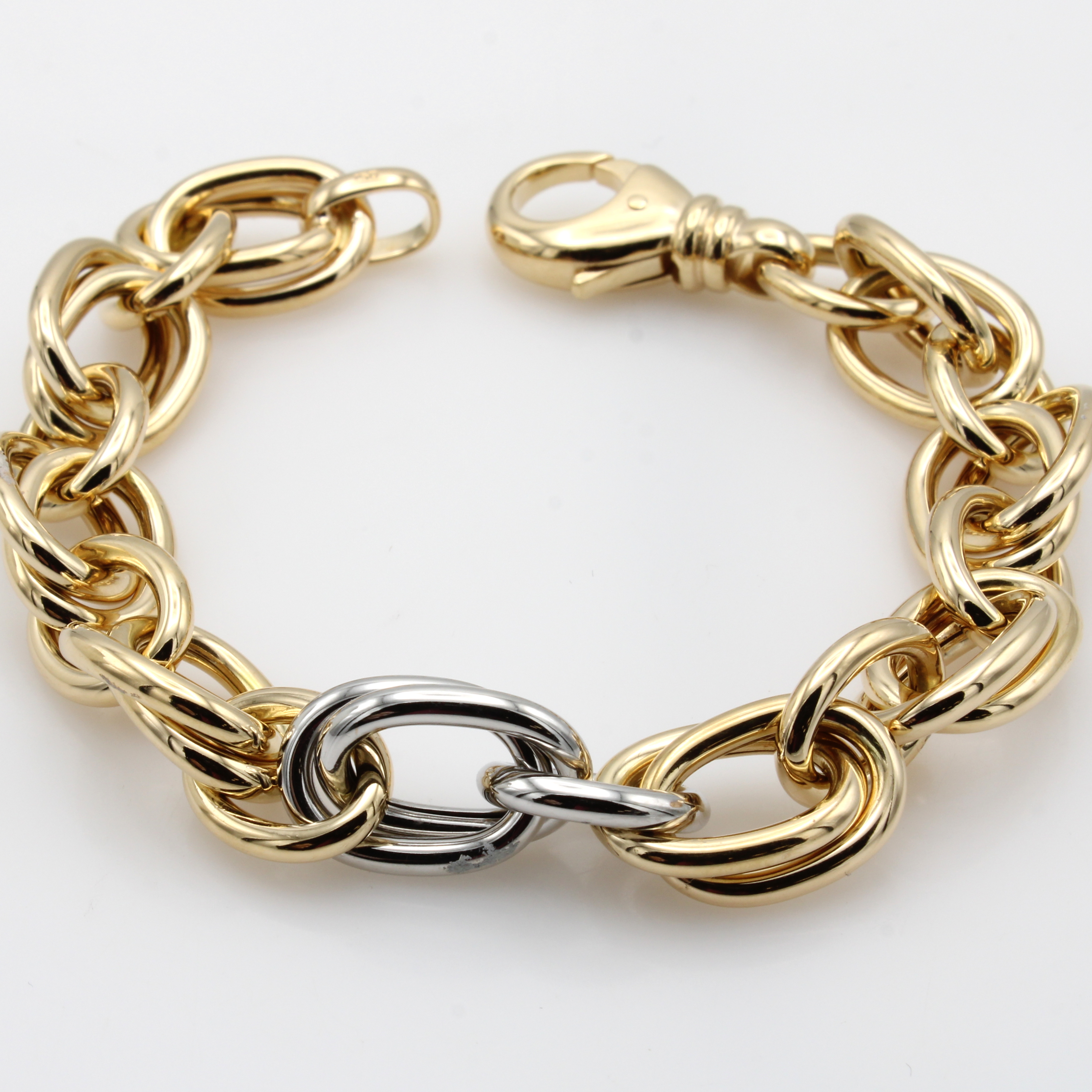 Armband, GG/WG 750/000, z.T. Zwillingsanker-glieder und 3 Glieder in WG Karabinerschl., L. ca. 21 cm, massive Handarbeit aus Pforz- heim