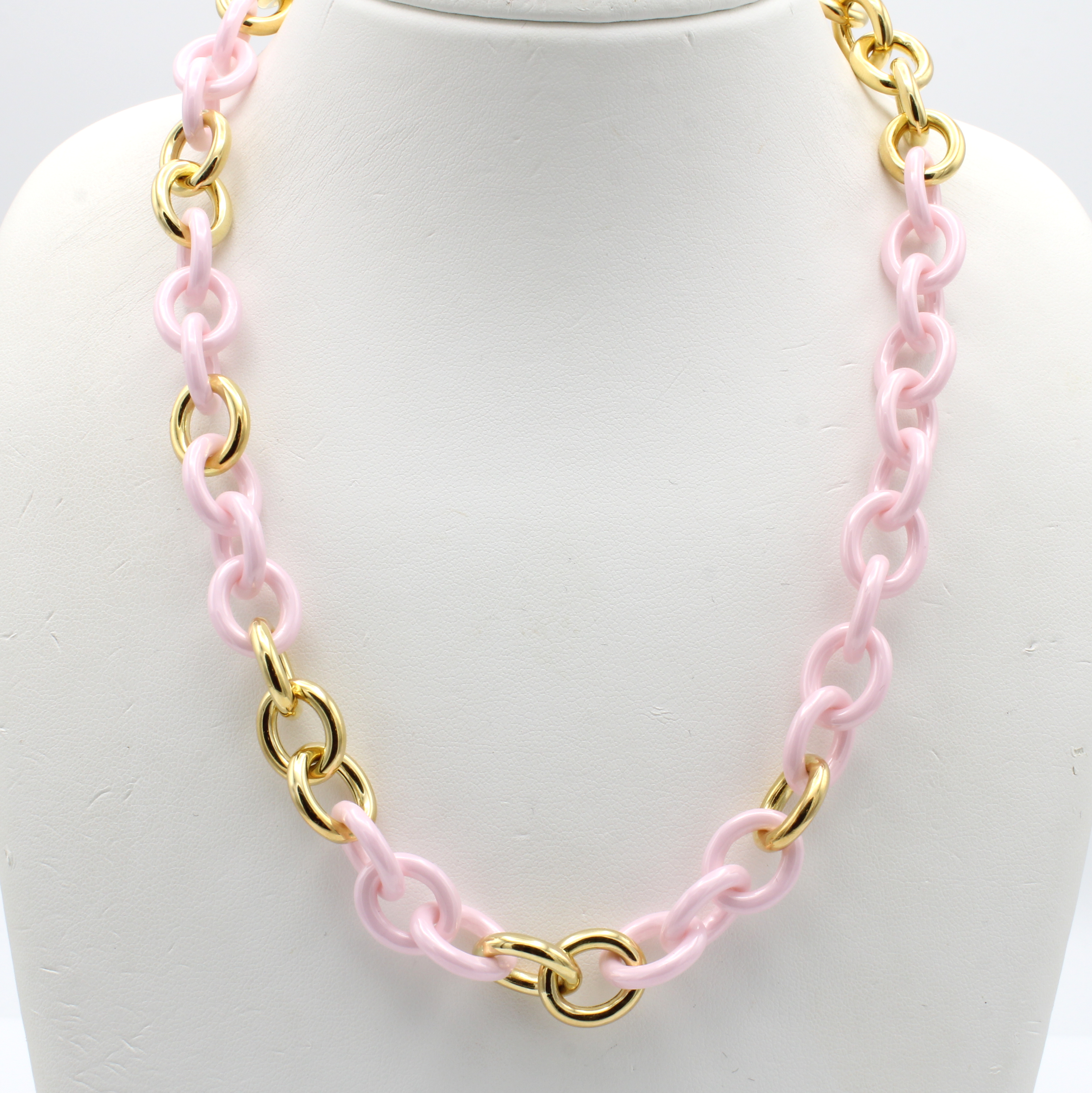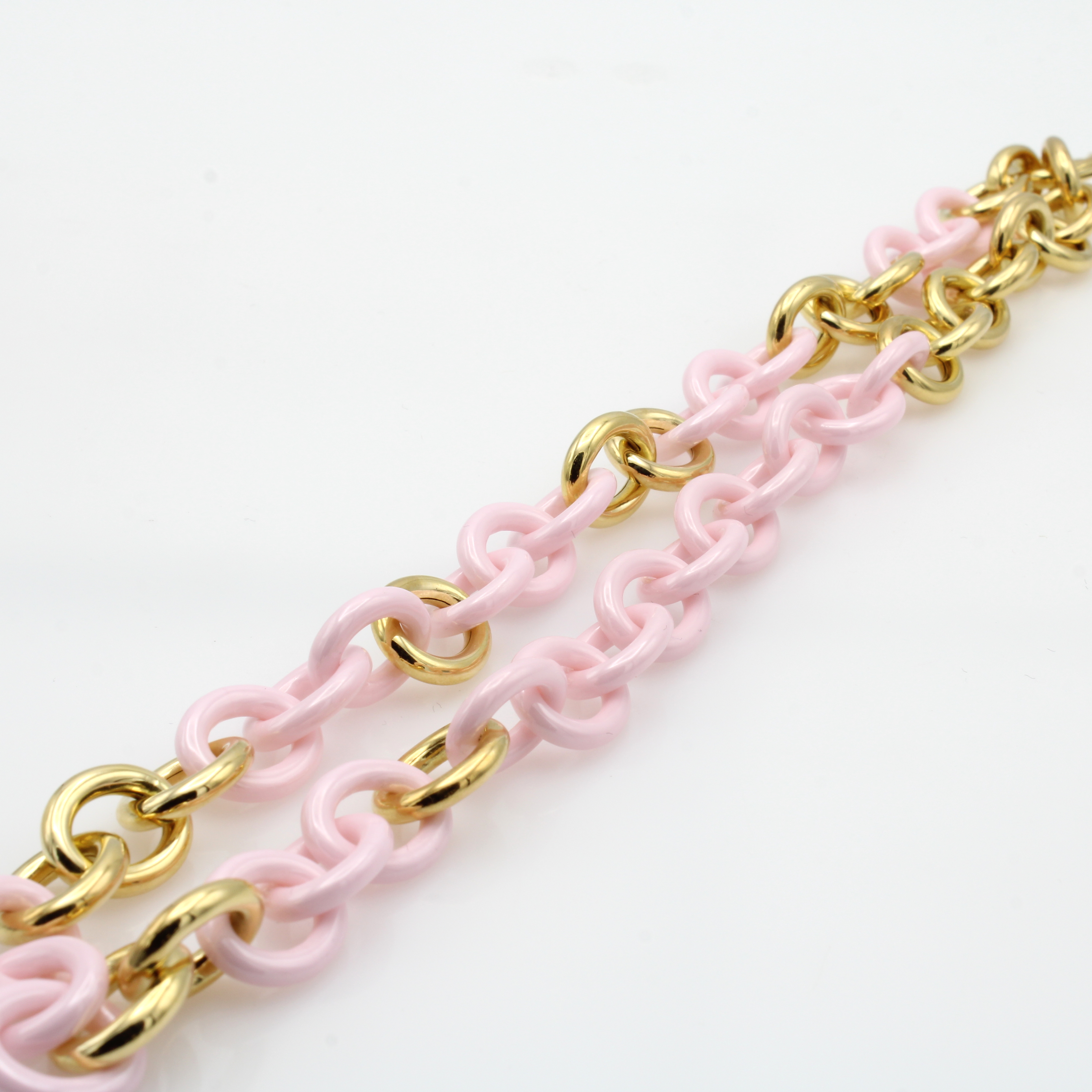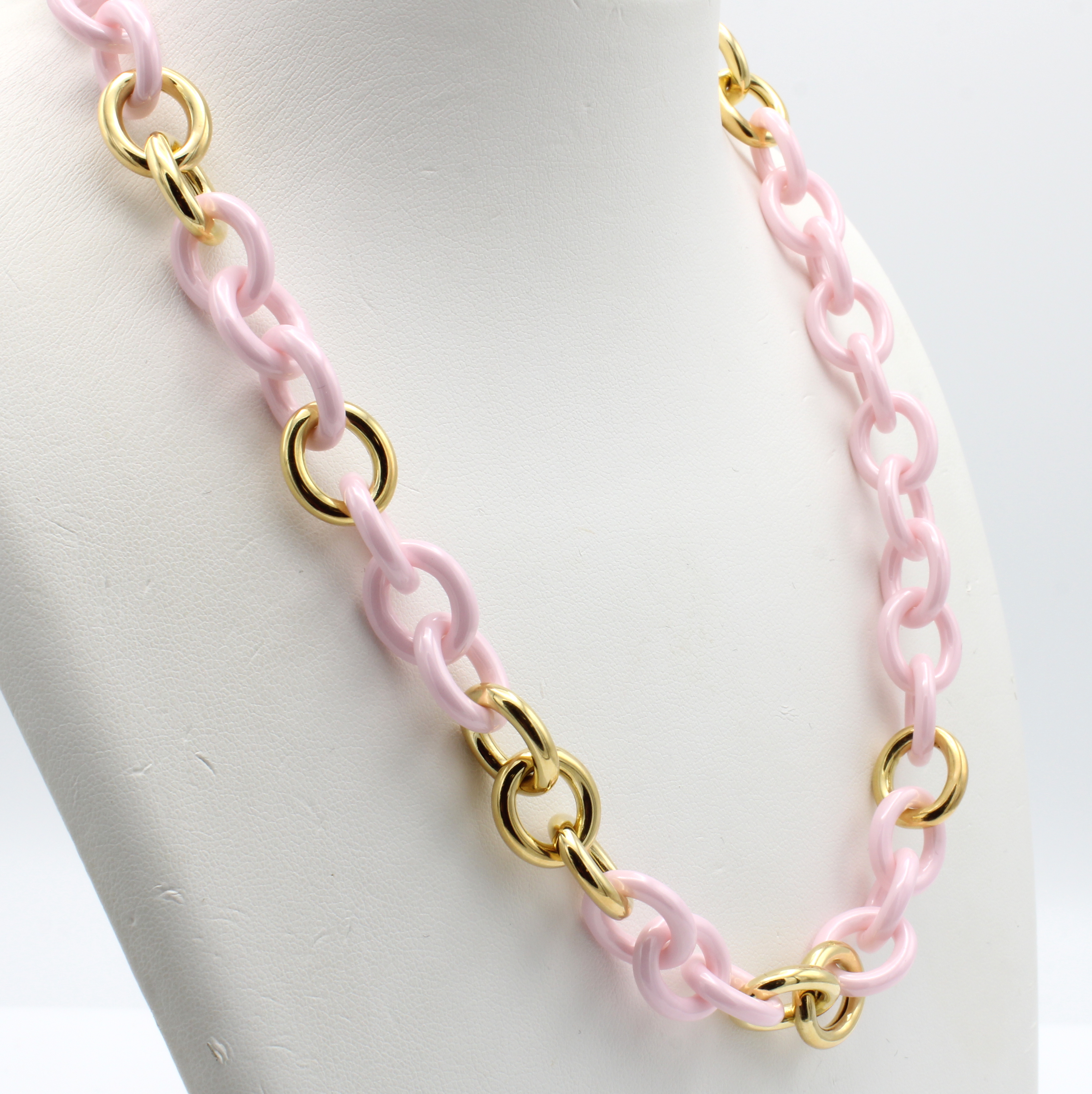 Collier mit Keramikzwischenteilen, GG 750/ 000, runde Glieder, zart rose Keramikglieder, Federringschließe, Pforzheimer Goldschmiede- arbeit, L. ca. 47 cm