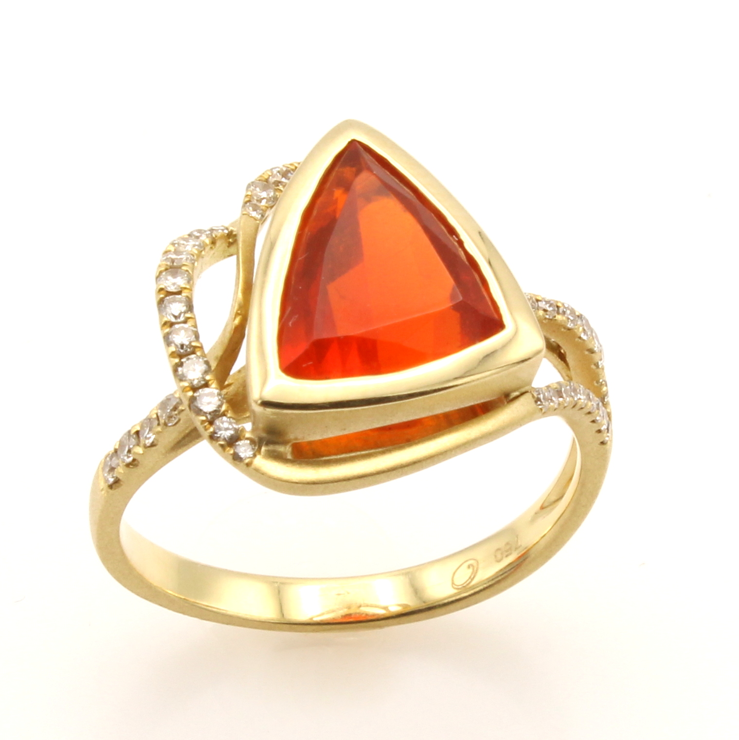 Ring mit Feueropal und Brillanten, GG 750/ 000, z.T. matt., mexikanischer Feueropal ca. 1.80 ct, 41 Brill. zus. ca. 0.27 ct feines Weiß/si, RW ca. 55 Schätzpreis: 3800, - EUR