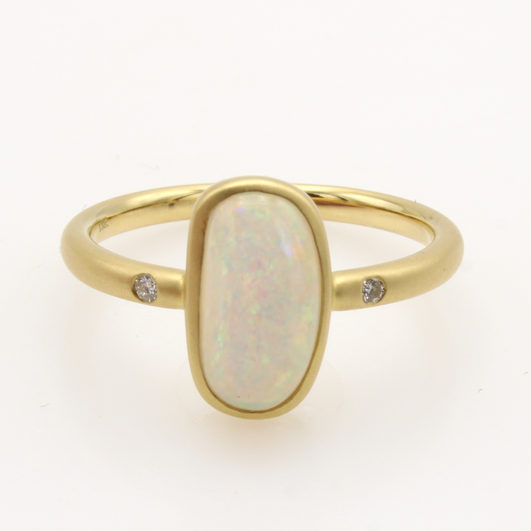 Ring mit Opal und Brillanten, GG 750/000, z.T. matt., 2 Brill. zus. ca. 0.03 ct Weiß/si,Opal ca. 1.59 ct, RW ca. 56 Schätzpreis: 2100, - EUR