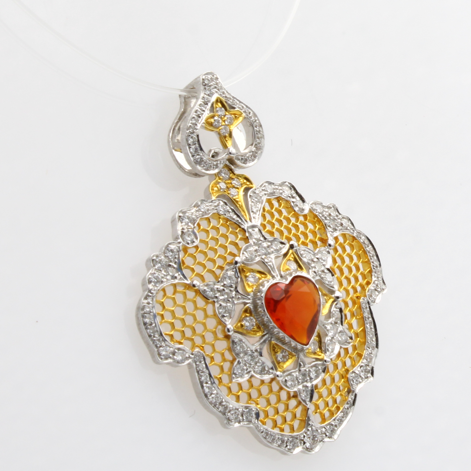 Anhänger mit Feueropal und Brillanten, GG 750/000, m. Ajourarbeit, mexikanischer Feuer- opal in Herzform fac., 119 Brill. zus. ca. 0.62 ct Weiß/si Schätzpreis: 3800, - EUR