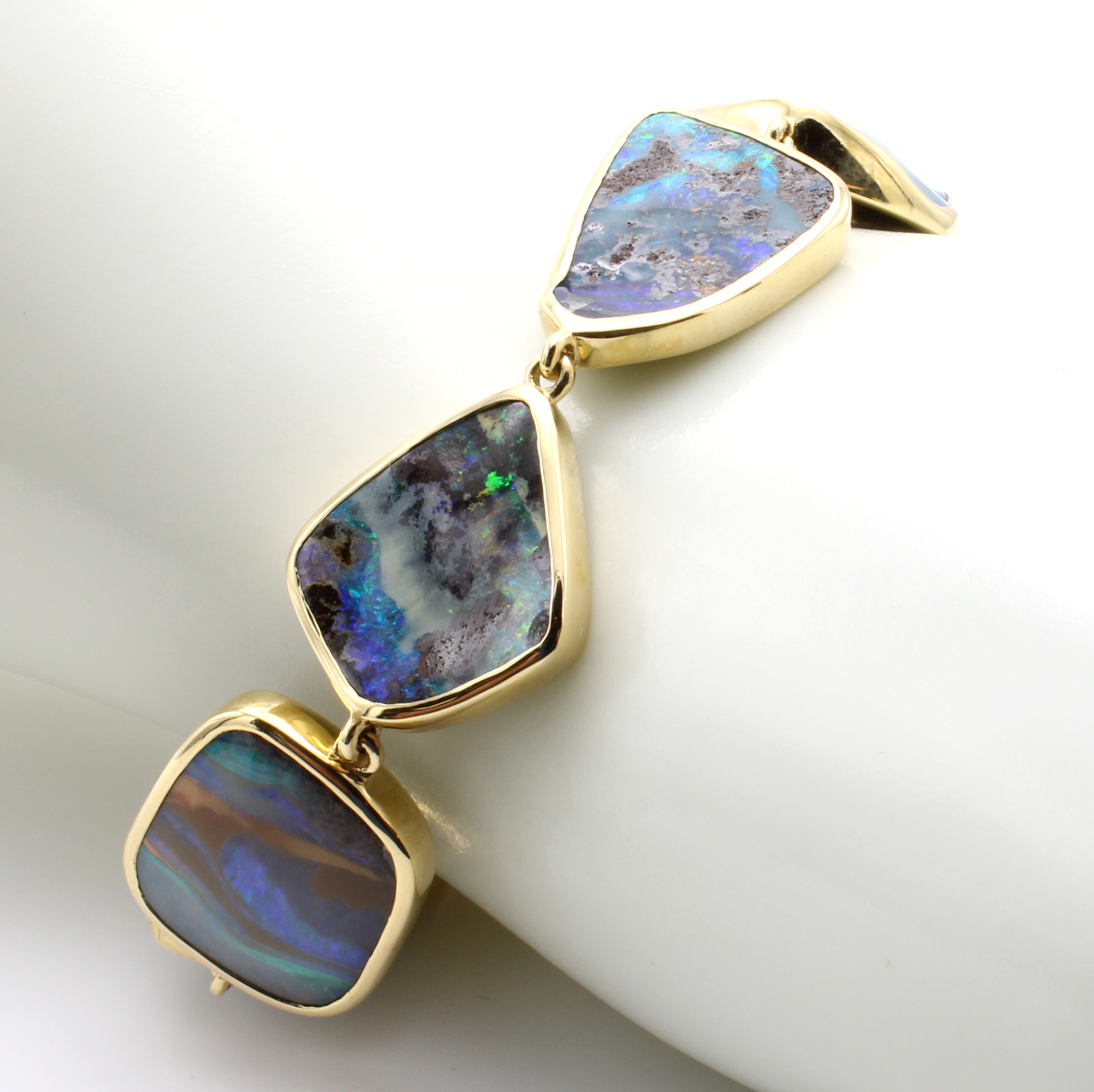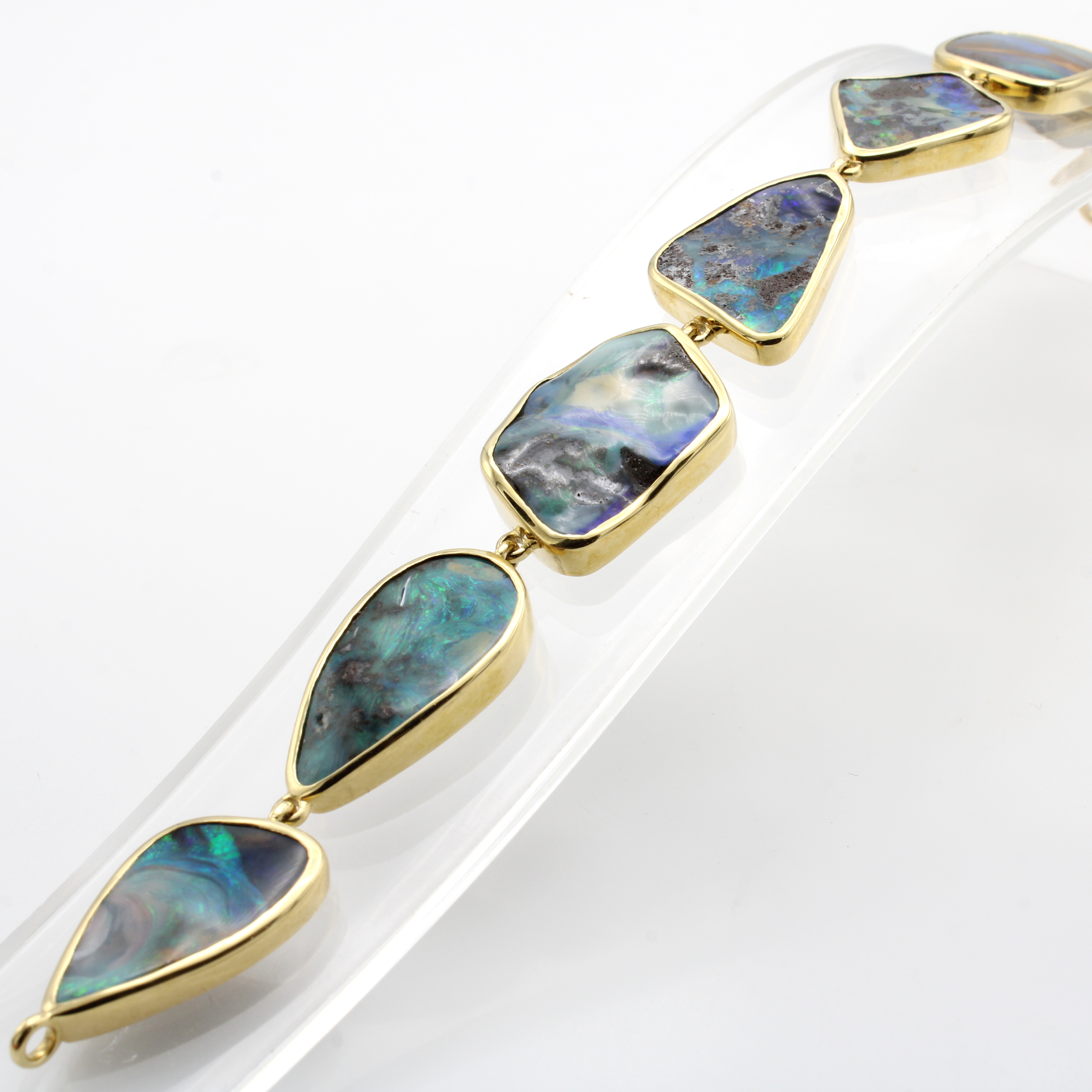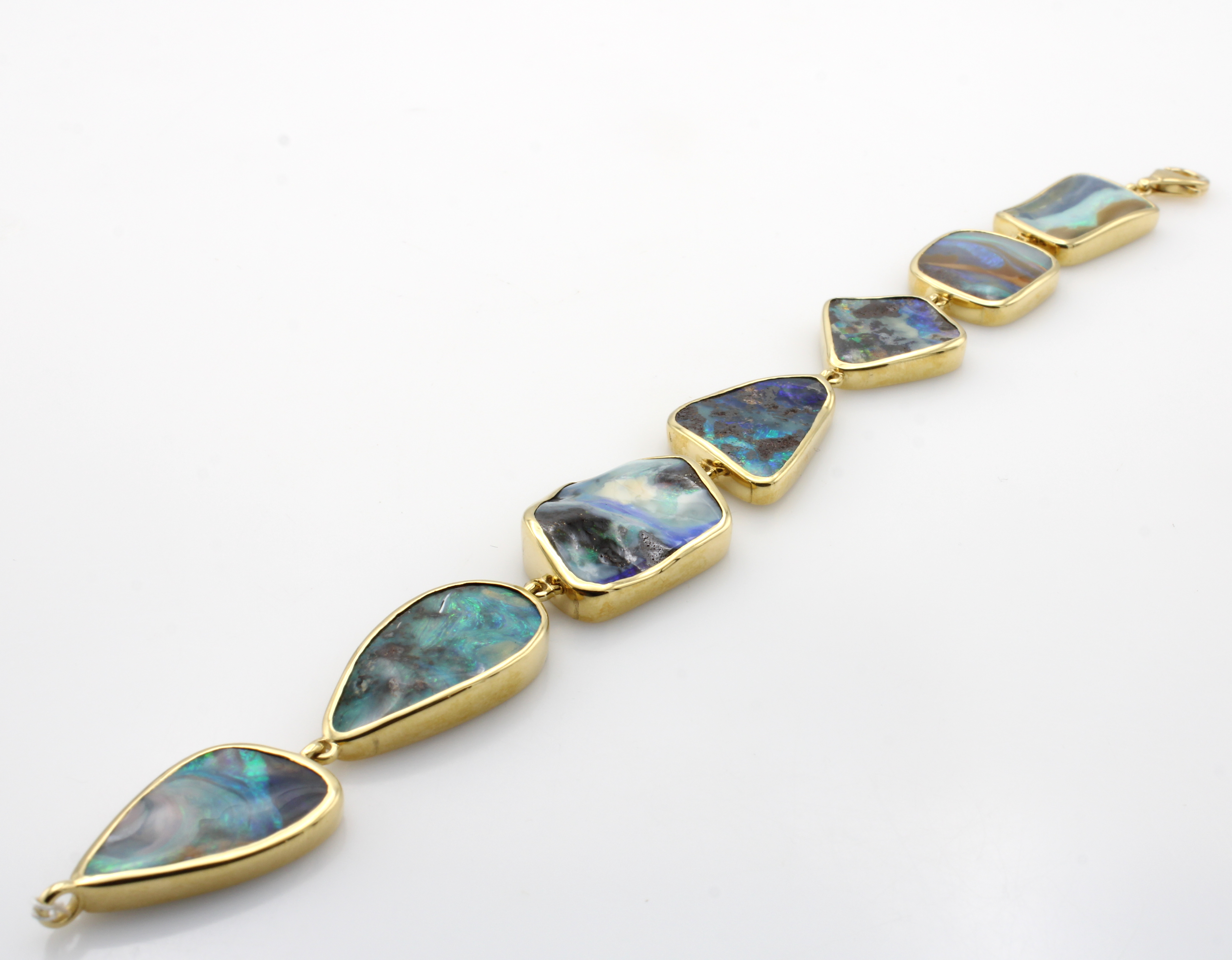 Armband mit Boulderopalen, GG 750/000, 7 Opale in versch. Formen u. Größen zus. ca. 70.3 ct, Karabinerschl., L. ca. 19 cm Schätzpreis: 11850, - EUR