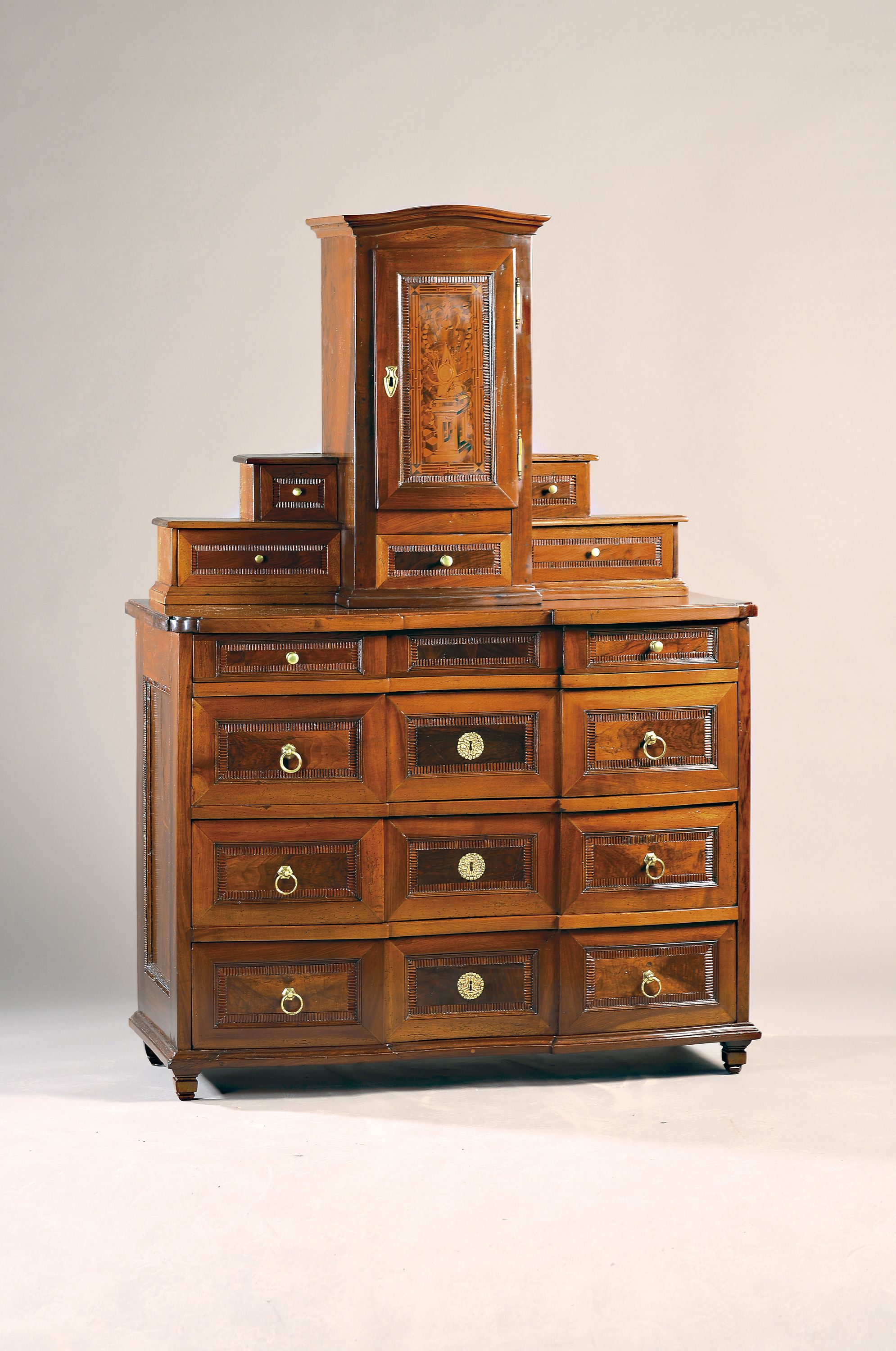 Aufsatz mit 5 Schubladen und aufwendig intarsierter Türe dahinter weitere Schubladen,