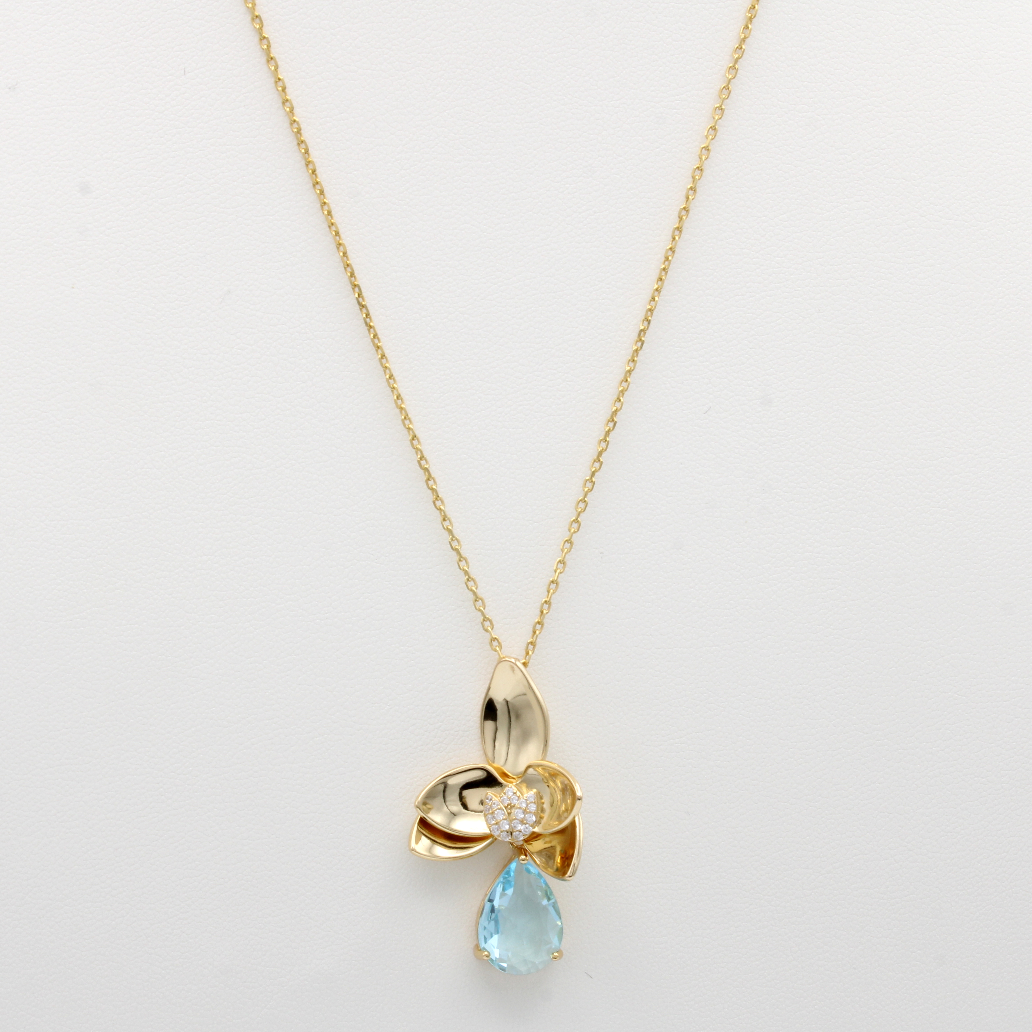 Anhänger "Blüte" mit Zirkonias, 925er Silber vergoldet, tropfenf. blauer Zirkonia als bewegl. Abhängung, L. ca. 50 cm
