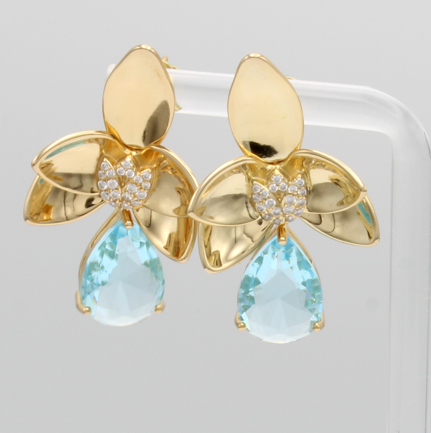 Paar Ohrstecker "Blüte" mit Zirkonias, 925er Silber vergoldet, tropfenf. blaue Zirkonias als Abhängung bewegl.