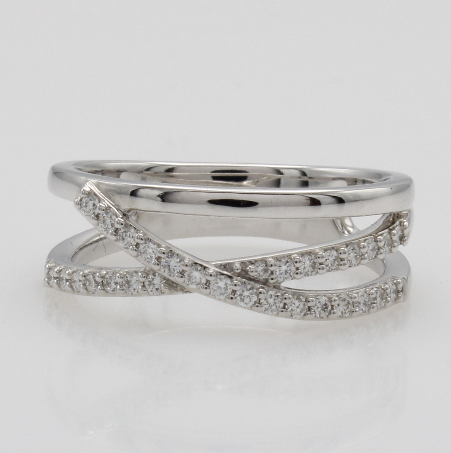 Ring mit Brillanten, WG 585/000, offene überschlagene Ringschiene, Brill. zus. ca. 0.30 ct Weiß/si, RW ca. 56 Schätzpreis: 2650, - EUR